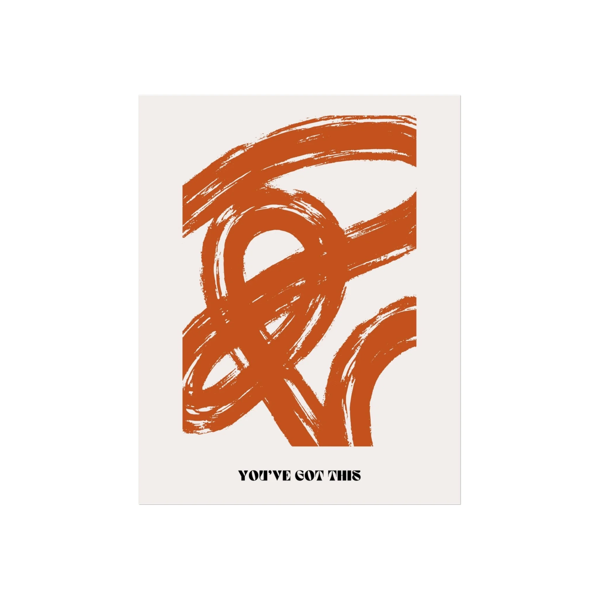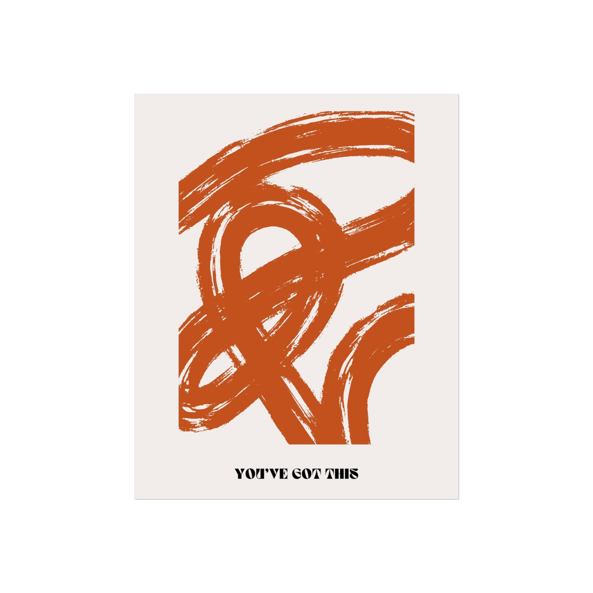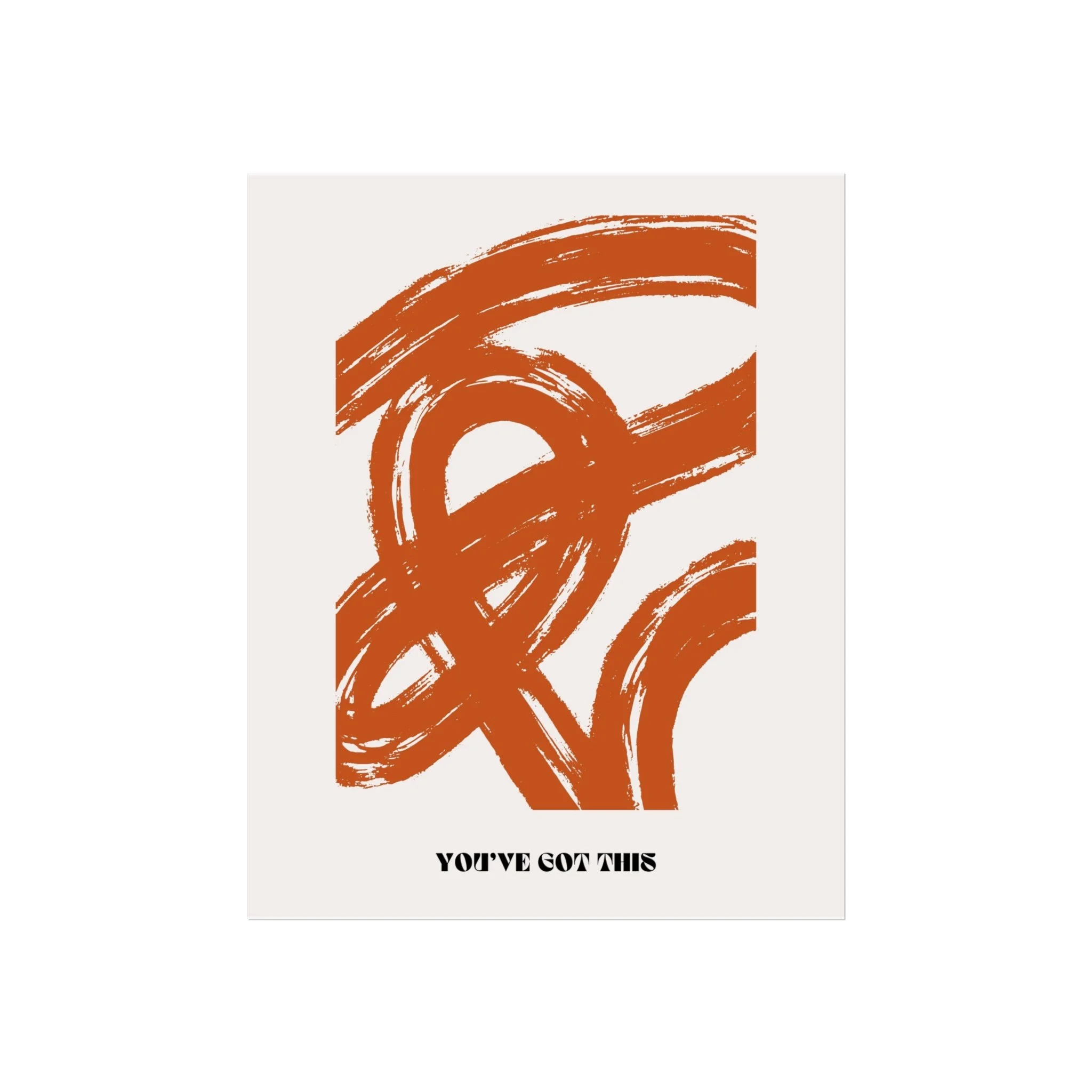 A warm, tactile art print that brings handcrafted energy to calm, modern spaces. Broad, painterly strokes in burnt sienna curl across a soft, off-white field, carrying a gentle, determined message at the base: “YOU’VE GOT THIS.” It reads like a quiet pep talk on the wall — bold but not loud, expressive but considered. This poster layers gallery-grade paper and giclée print quality to preserve rich color depth and brush texture, making it feel like an original study rather than a mass-produced poster. Hang it above a bedside shelf, in a home office, or near a reading nook to create a small moment of reassurance every day.
