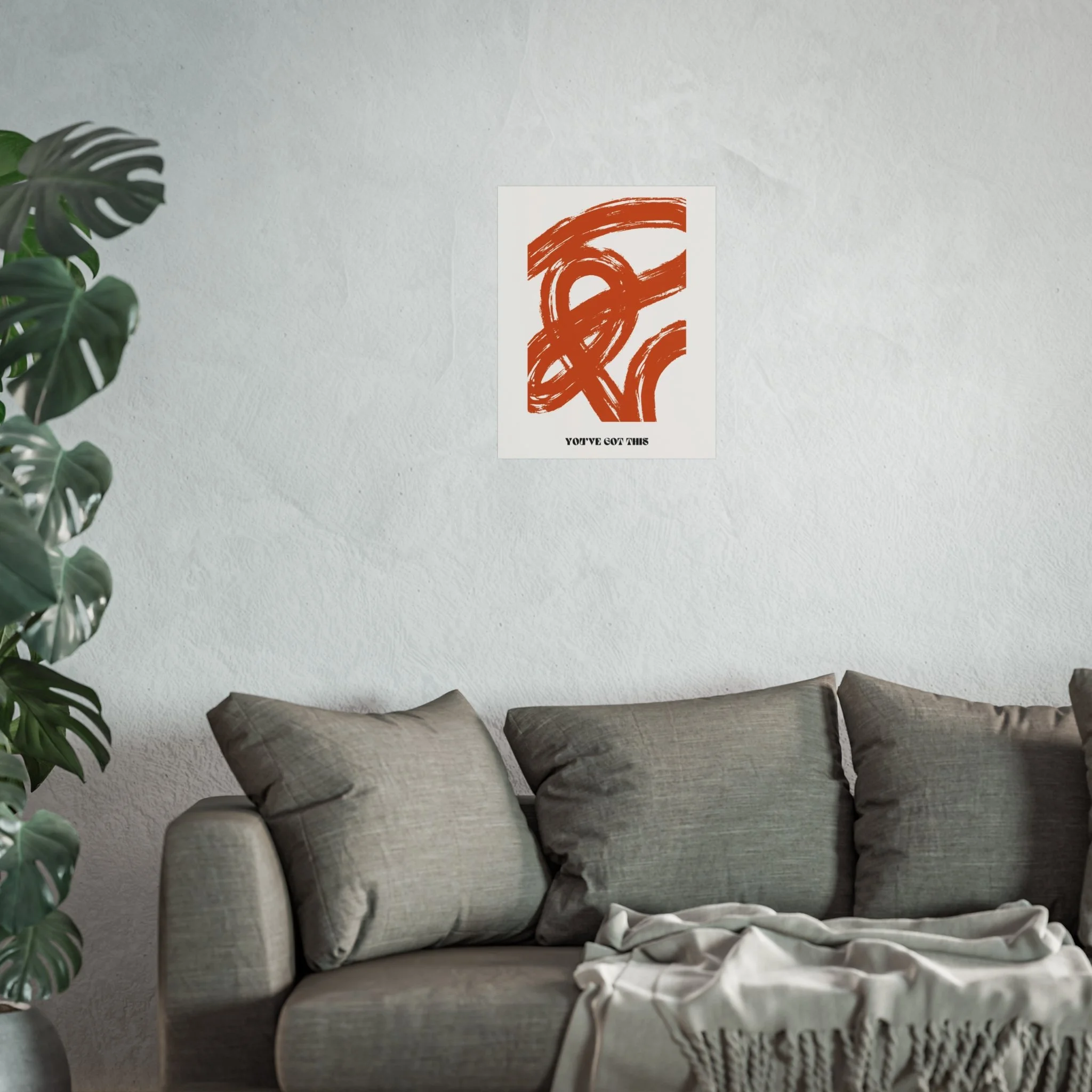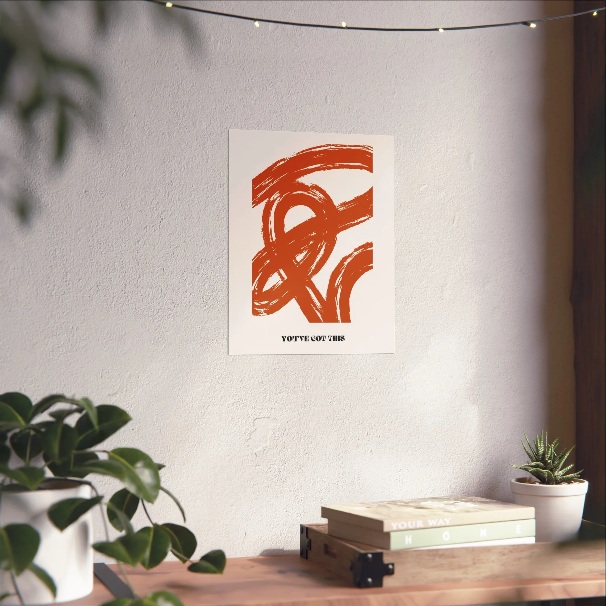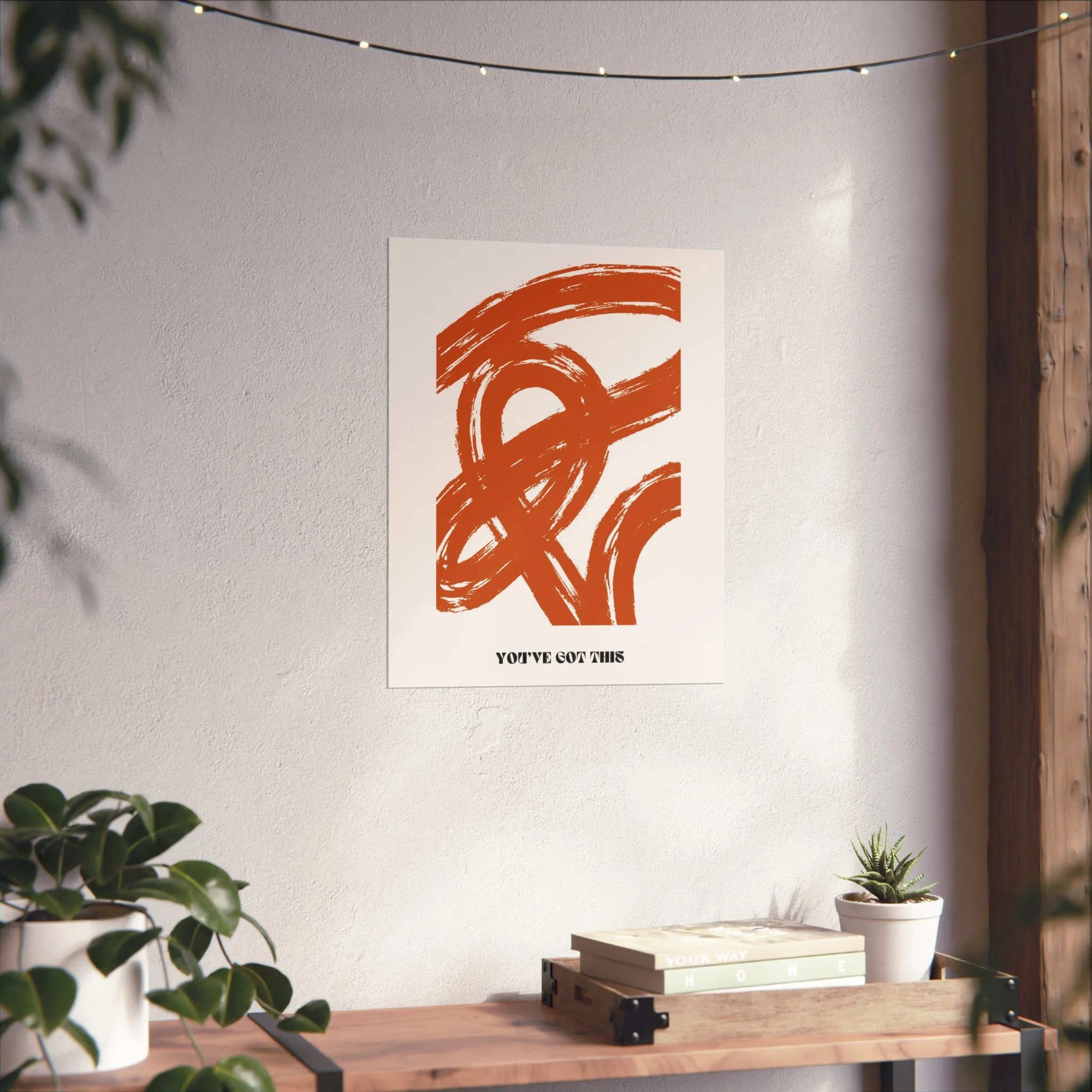 A warm, tactile art print that brings handcrafted energy to calm, modern spaces. Broad, painterly strokes in burnt sienna curl across a soft, off-white field, carrying a gentle, determined message at the base: “YOU’VE GOT THIS.” It reads like a quiet pep talk on the wall — bold but not loud, expressive but considered. This poster layers gallery-grade paper and giclée print quality to preserve rich color depth and brush texture, making it feel like an original study rather than a mass-produced poster. Hang it above a bedside shelf, in a home office, or near a reading nook to create a small moment of reassurance every day.