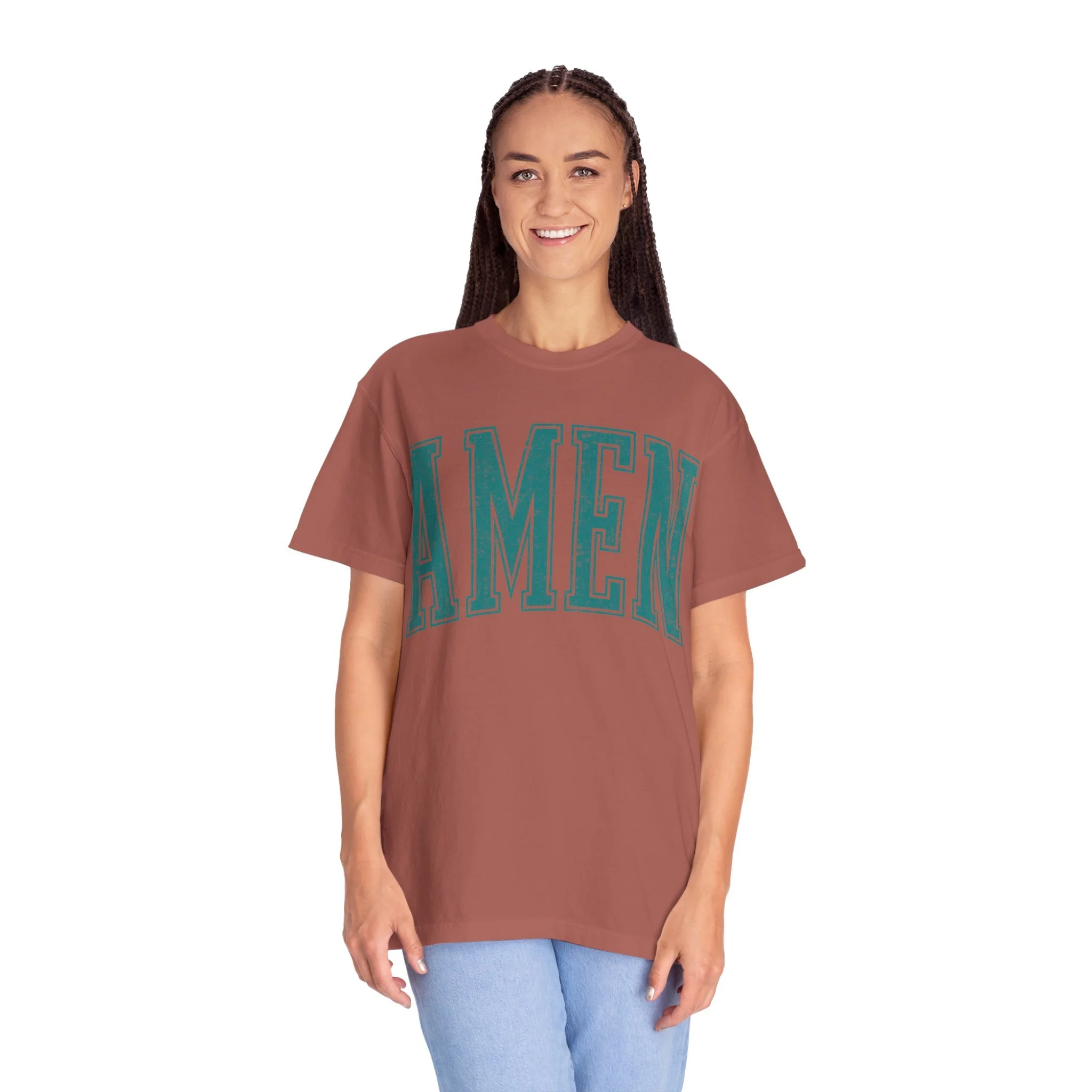 This heavyweight garment-dyed tee carries a relaxed, lived-in feel — soft to the touch with a bold, collegiate-style 'AMEN' across the chest. The vintage wash and sturdy 100% ring-spun cotton settle in like an old favorite, ready for Sunday mornings, community gatherings, or quiet coffee runs. It sits slightly roomy without looking oversized, draping naturally from the shoulders and keeping its shape thanks to double-needle stitching and a tubular, side-seam-free build. Wear it with jeans, under a shacket, or layered for cooler evenings — it’s the kind of shirt that becomes part of the rhythm of your week.