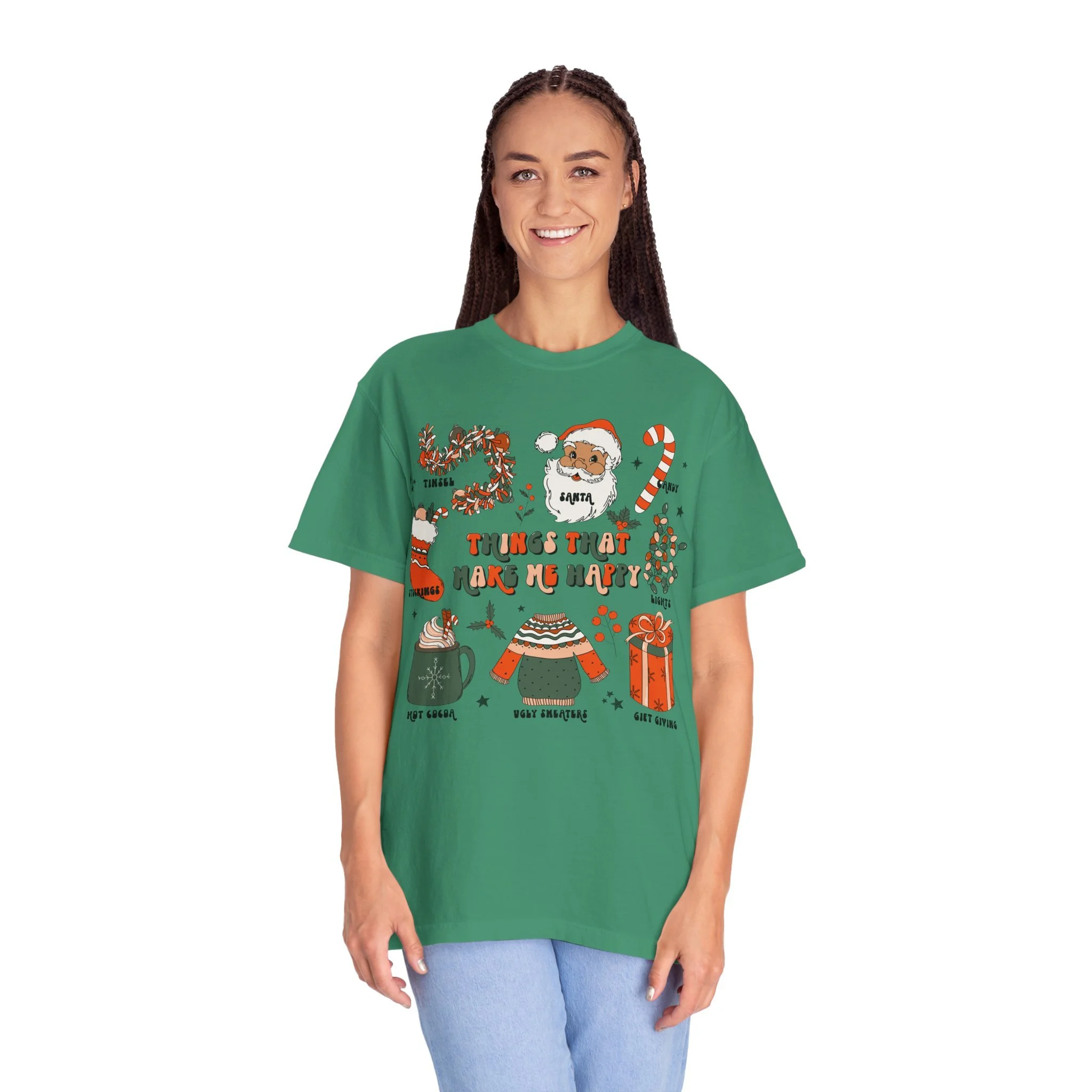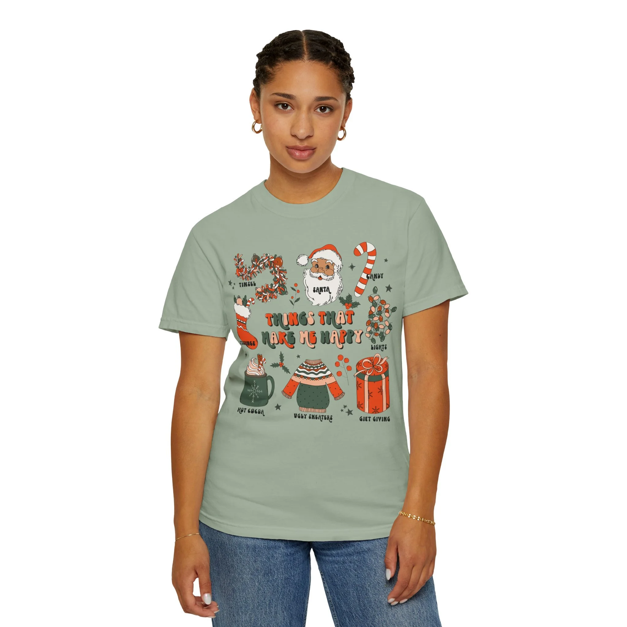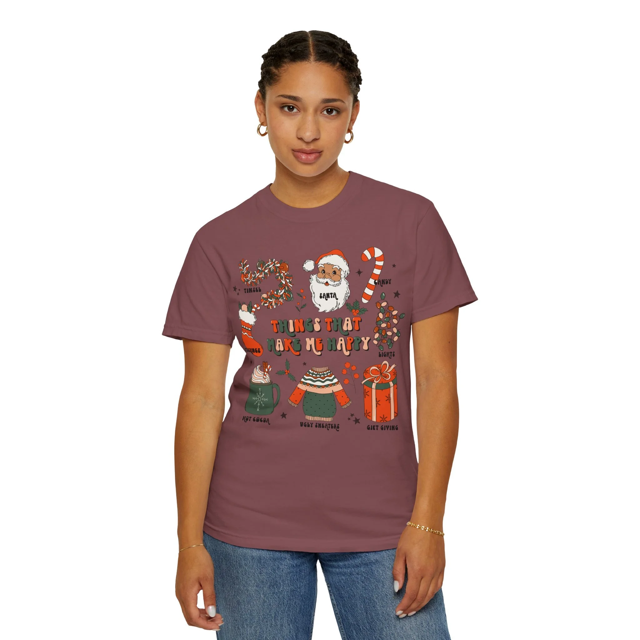 This relaxed-fit garment-dyed tee brings cozy holiday charm to everyday wear. Hand-drawn seasonal icons — a wreath, Santa face, candy cane, stocking, festive sweater, hot cocoa mug, and wrapped gift — cluster across the chest in warm reds, greens, and soft neutrals. The soft, garment-dyed cotton feels broken-in from day one and the medium-weight fabric holds printed detail without feeling bulky. Wear it for slow mornings with a mug, casual holiday gatherings, or layered under a jacket for caroling and tree-trimming nights. The design reads like a string of small pleasures — little rituals that make this season feel rooted, familiar, and easy to love.