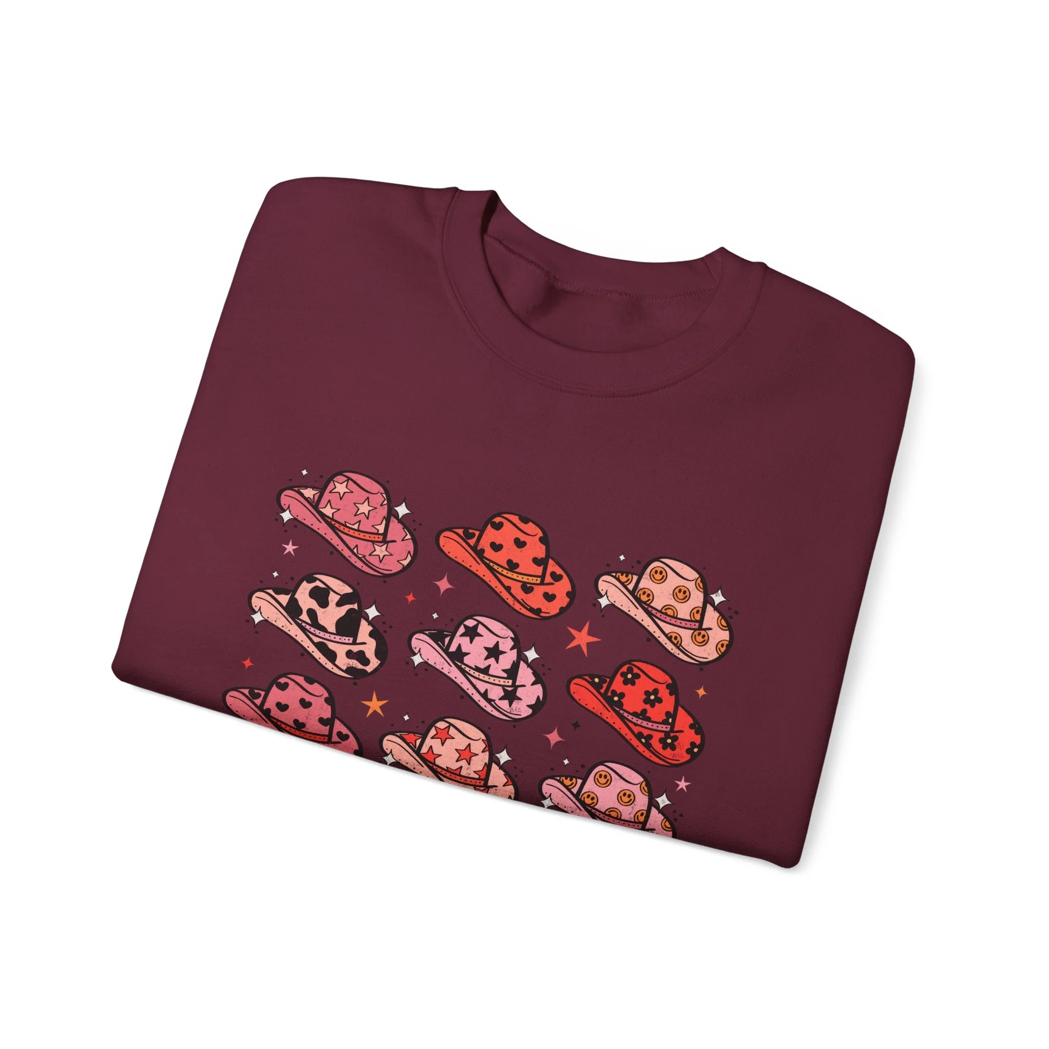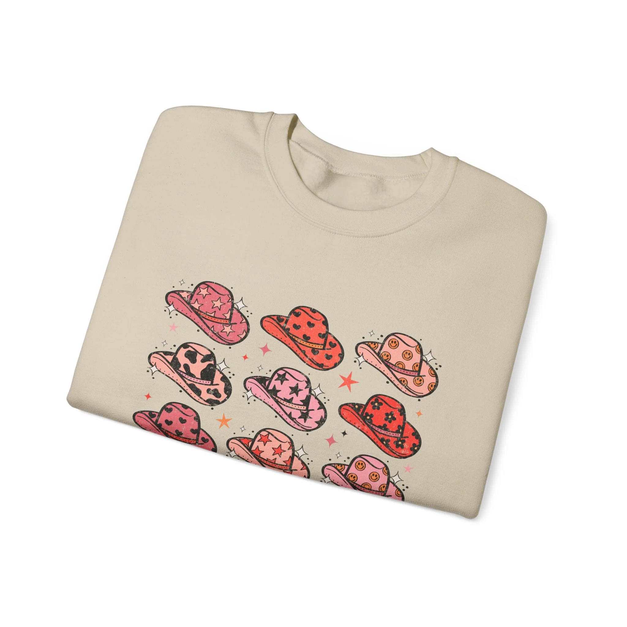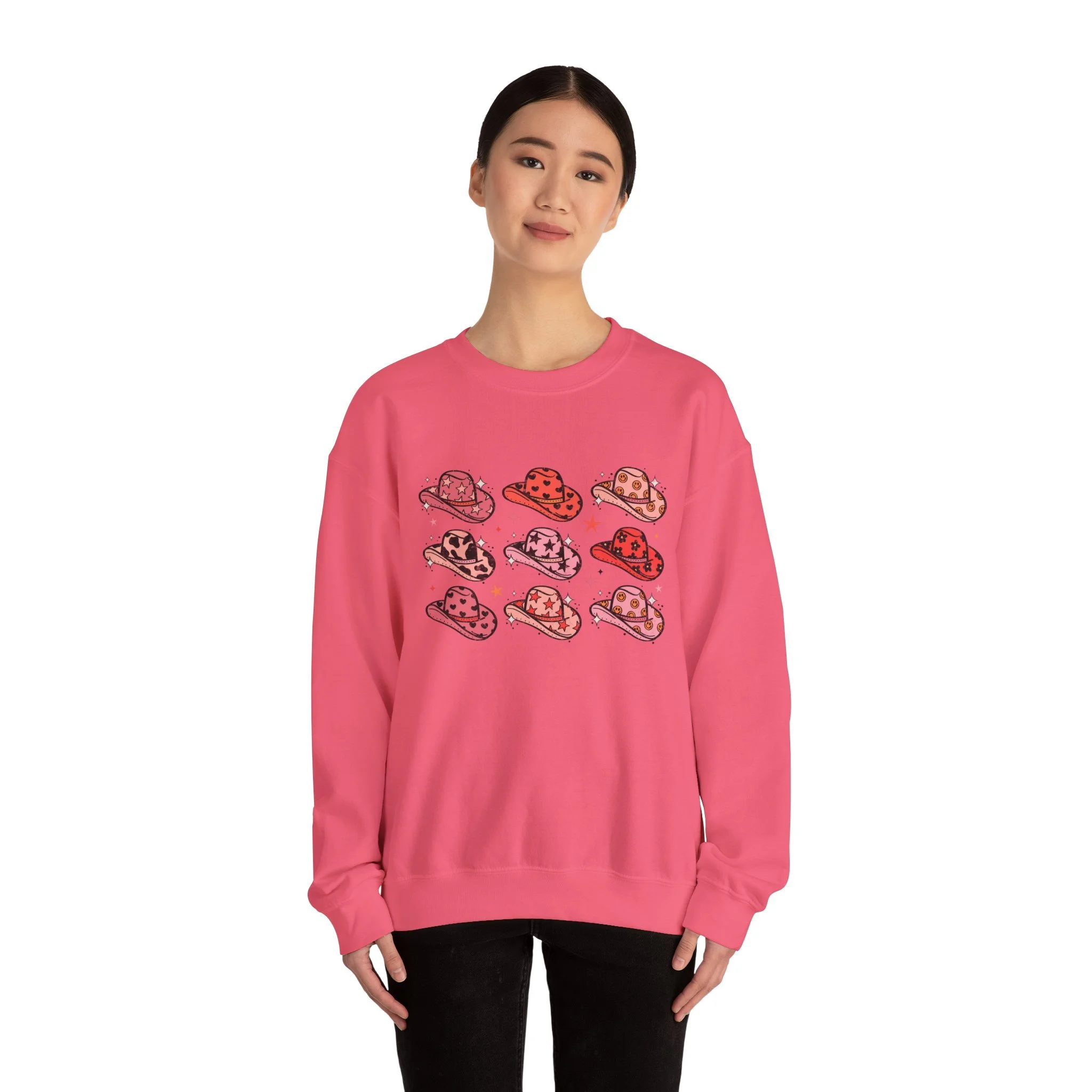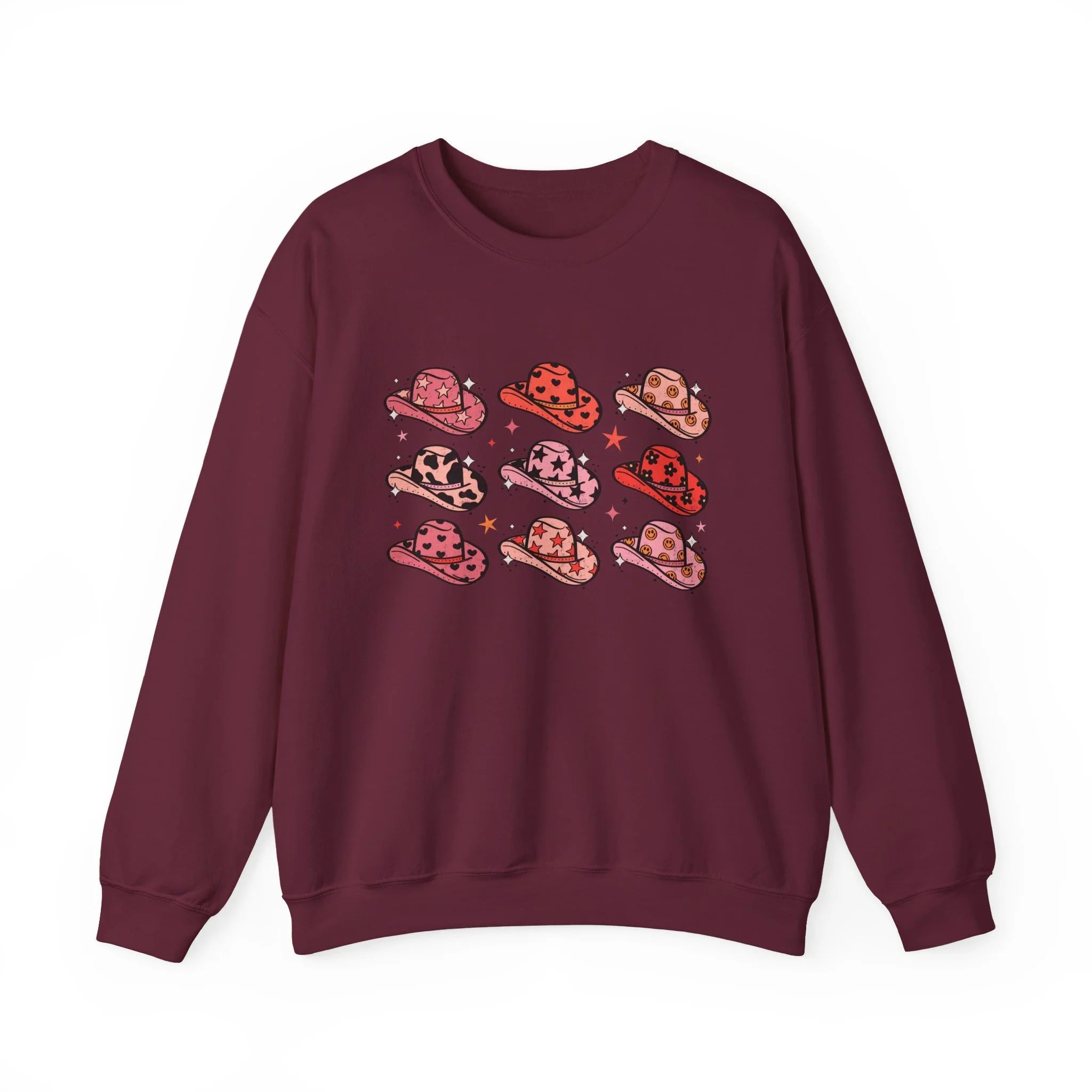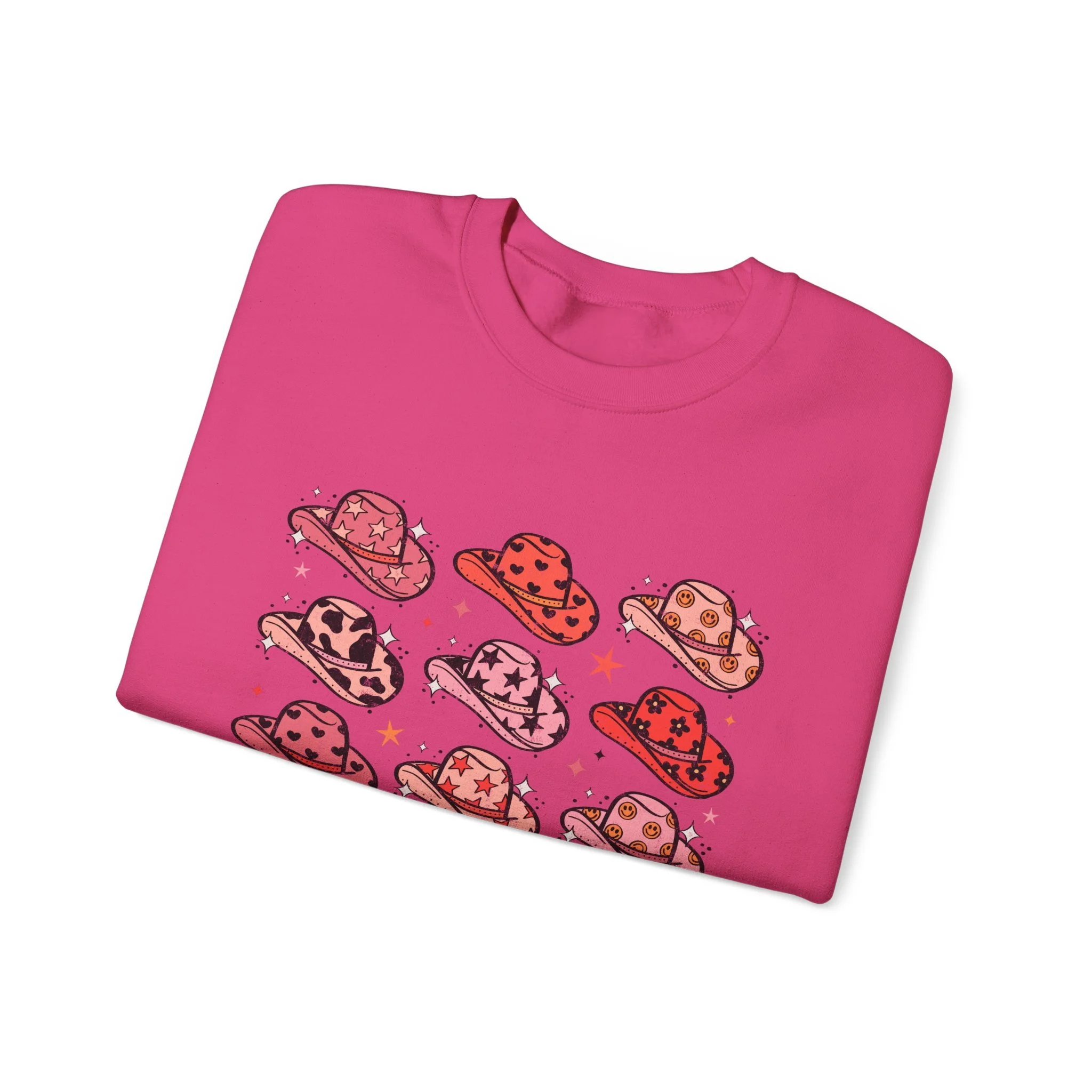 Soft, cozy, and quietly playful — this crewneck sweatshirt brings a touch of retro charm to everyday wear. Nine small cowboy hats in warm pinks and reds are printed in a neat grid across the chest, giving the sweatshirt a handcrafted, indie feel that pairs easily with jeans, joggers, or layered under a denim jacket. The medium-heavy 50/50 cotton-poly blend drapes comfortably without feeling bulky, and the ribbed collar and reinforced stitching hold up to frequent wear. Wear it on chilly mornings, late-night drives, or when you want an outfit that says low-key confidence and a little bit of country whimsy.