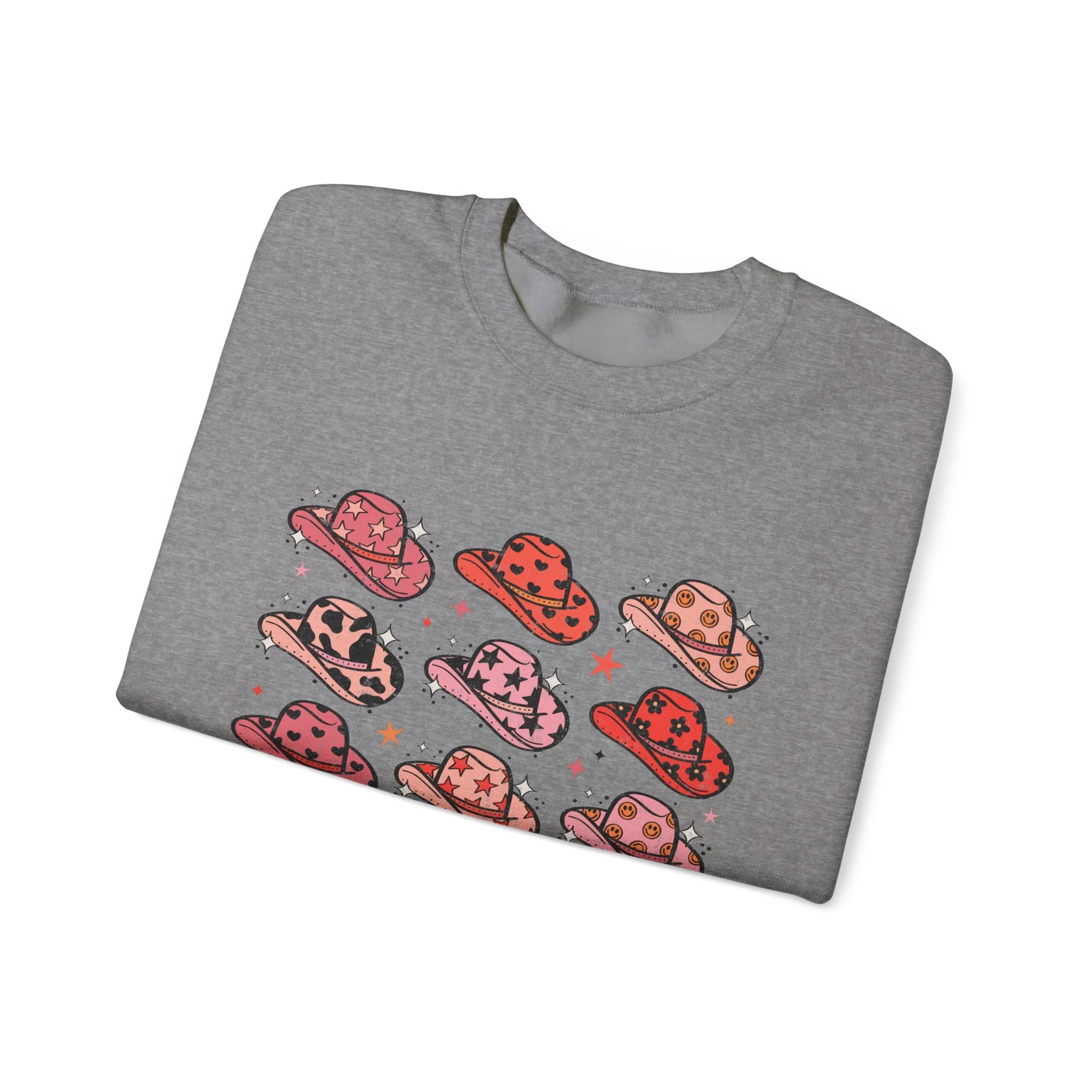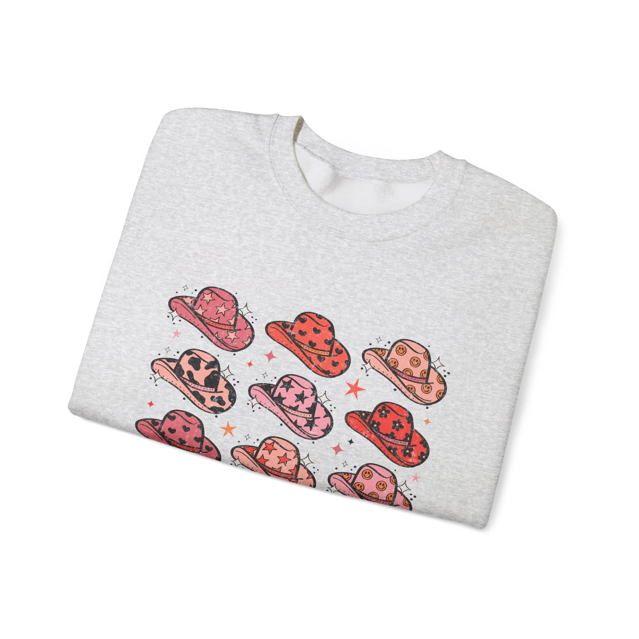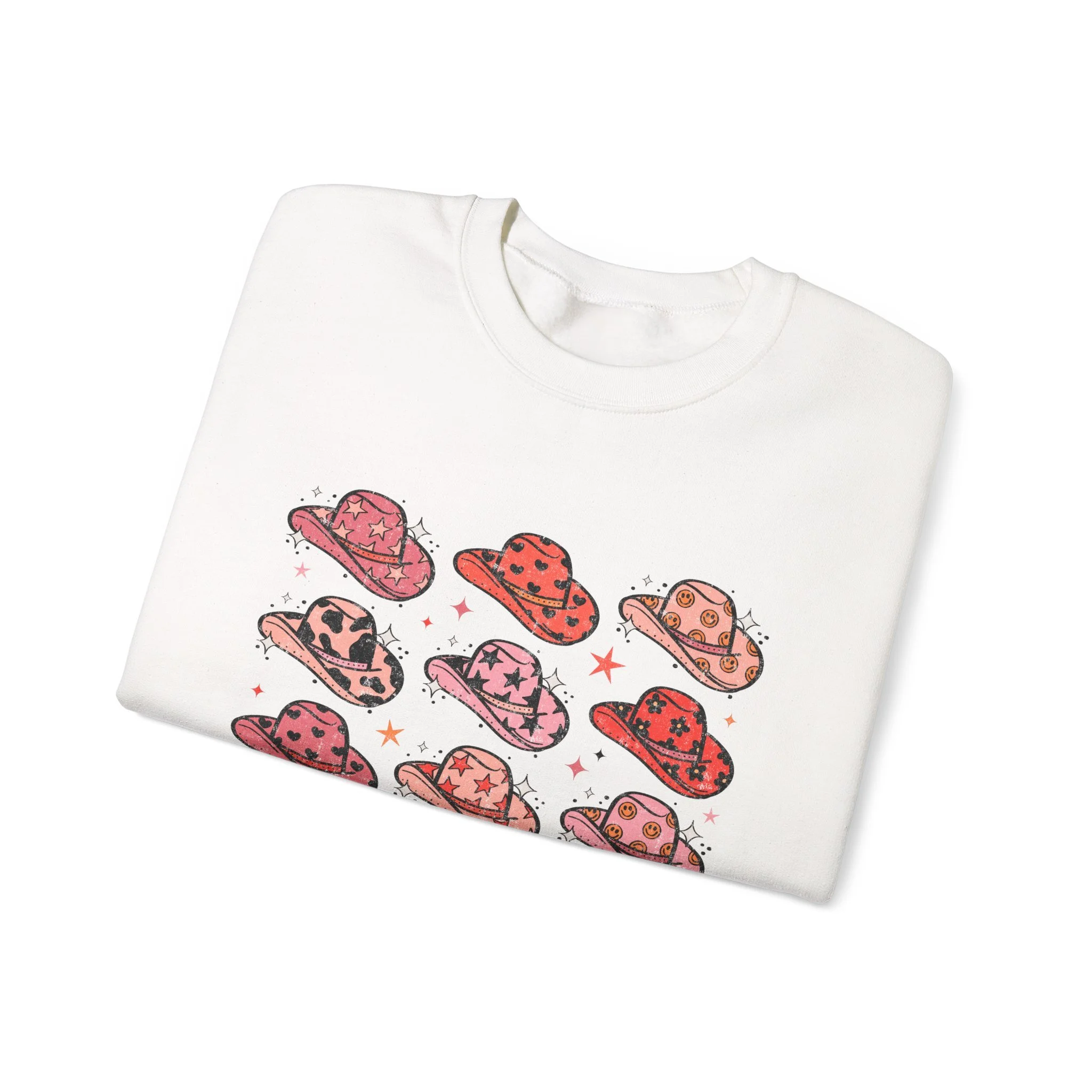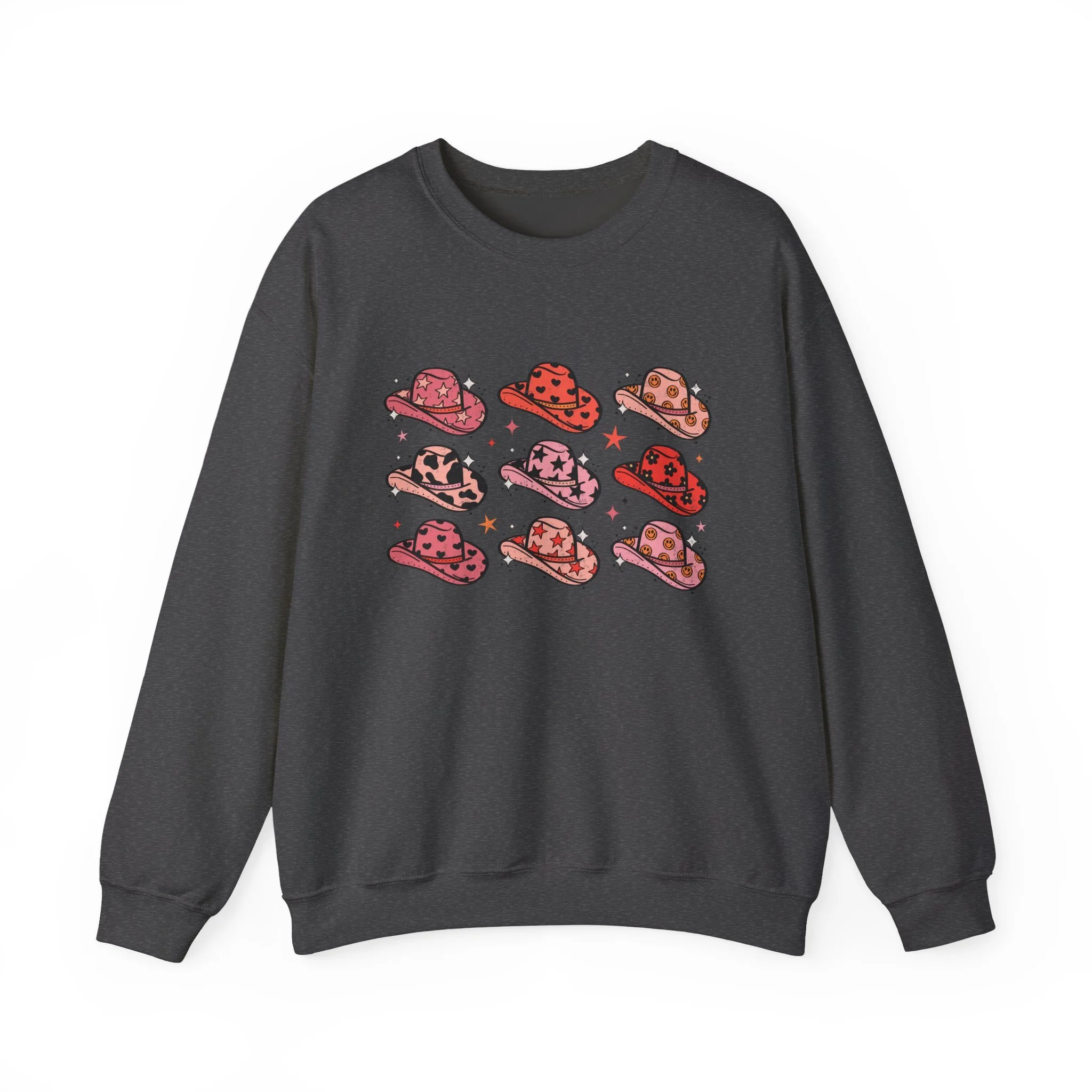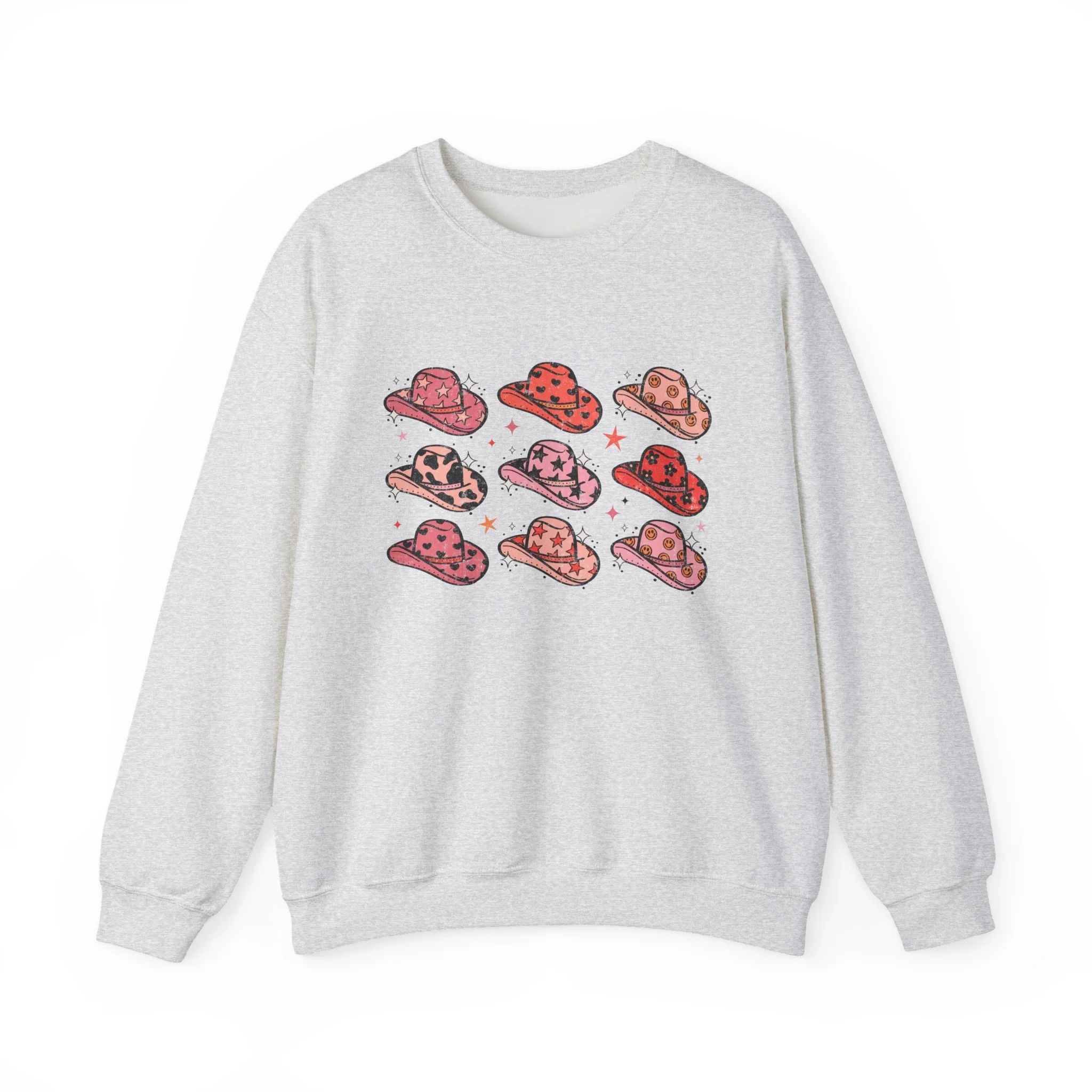 Soft, cozy, and quietly playful — this crewneck sweatshirt brings a touch of retro charm to everyday wear. Nine small cowboy hats in warm pinks and reds are printed in a neat grid across the chest, giving the sweatshirt a handcrafted, indie feel that pairs easily with jeans, joggers, or layered under a denim jacket. The medium-heavy 50/50 cotton-poly blend drapes comfortably without feeling bulky, and the ribbed collar and reinforced stitching hold up to frequent wear. Wear it on chilly mornings, late-night drives, or when you want an outfit that says low-key confidence and a little bit of country whimsy.
