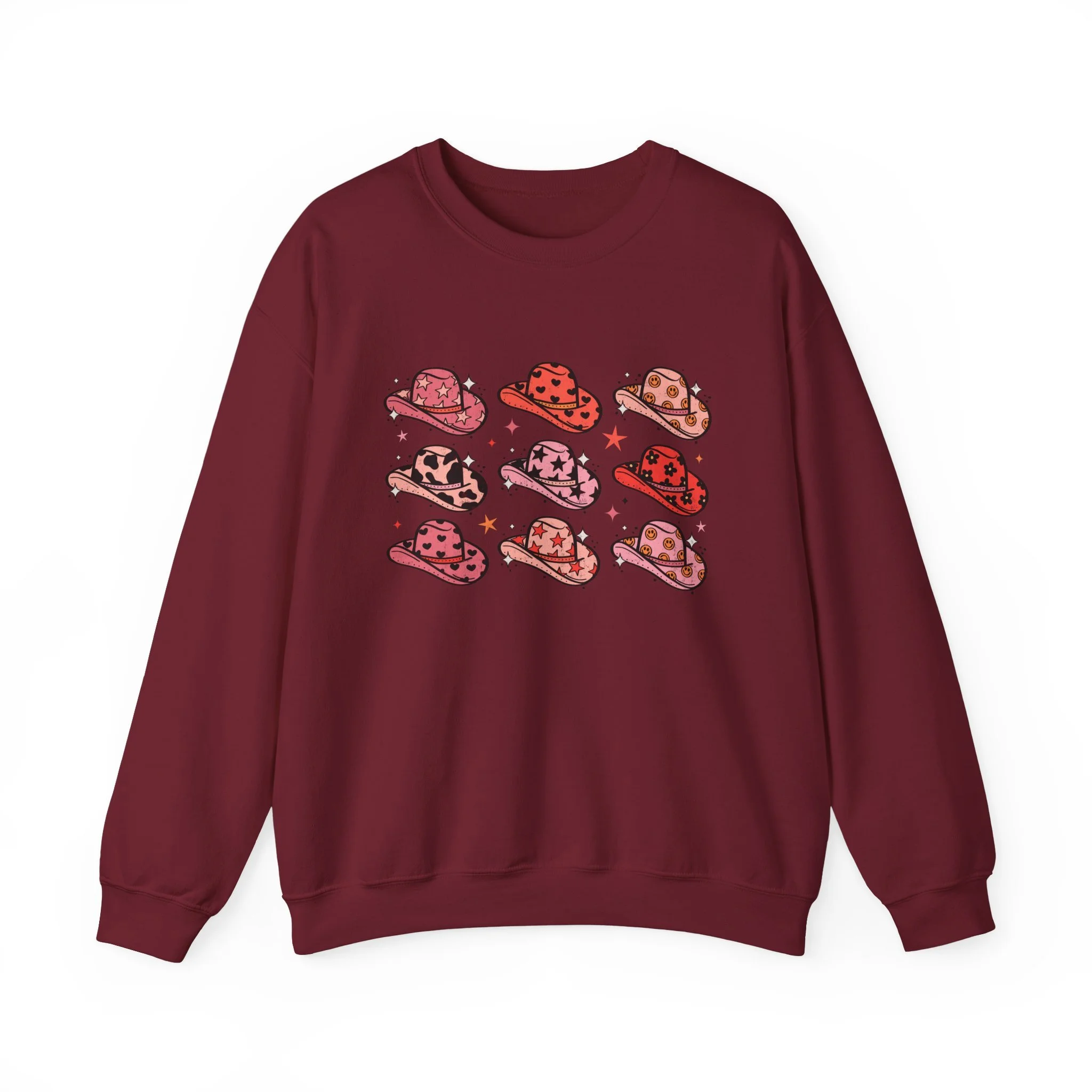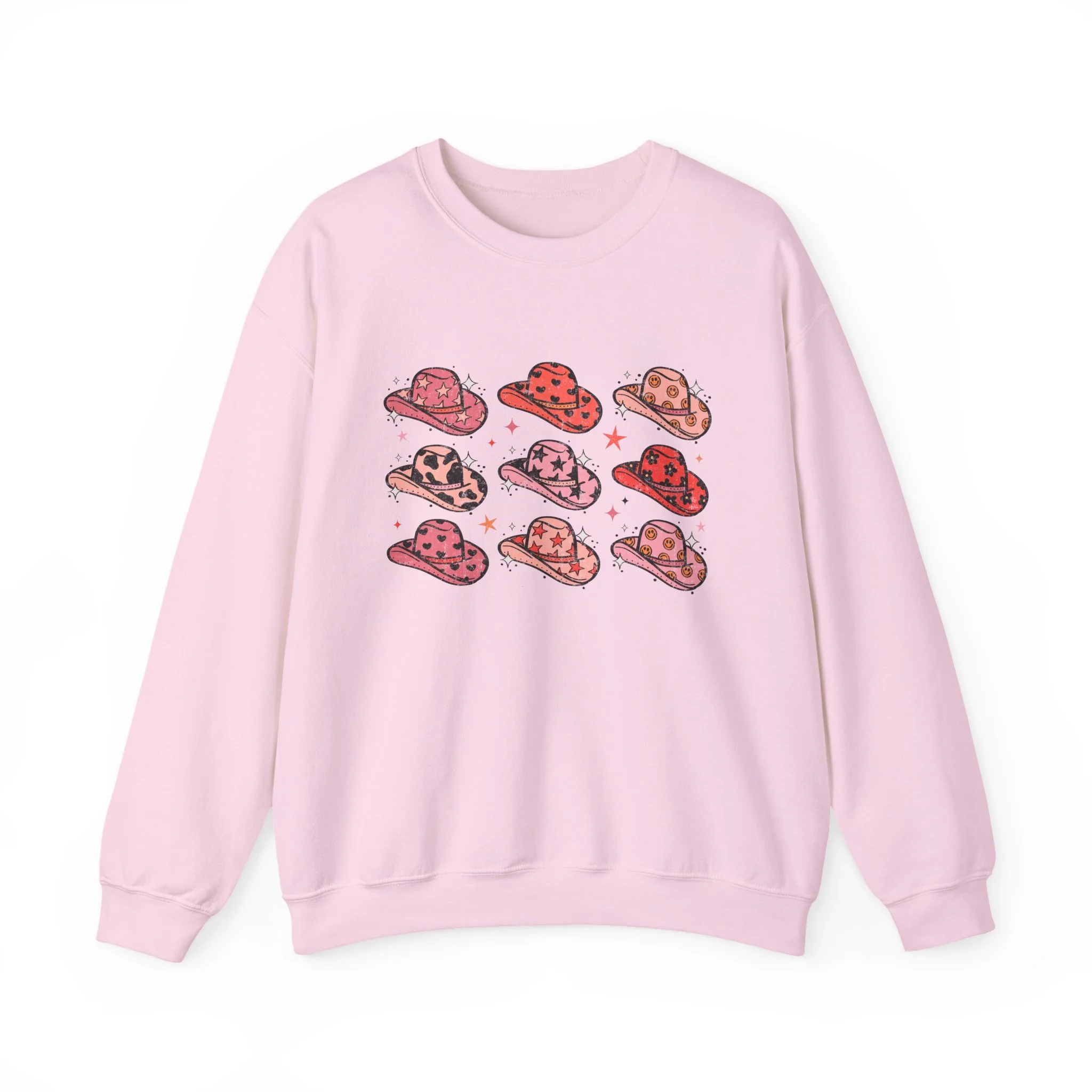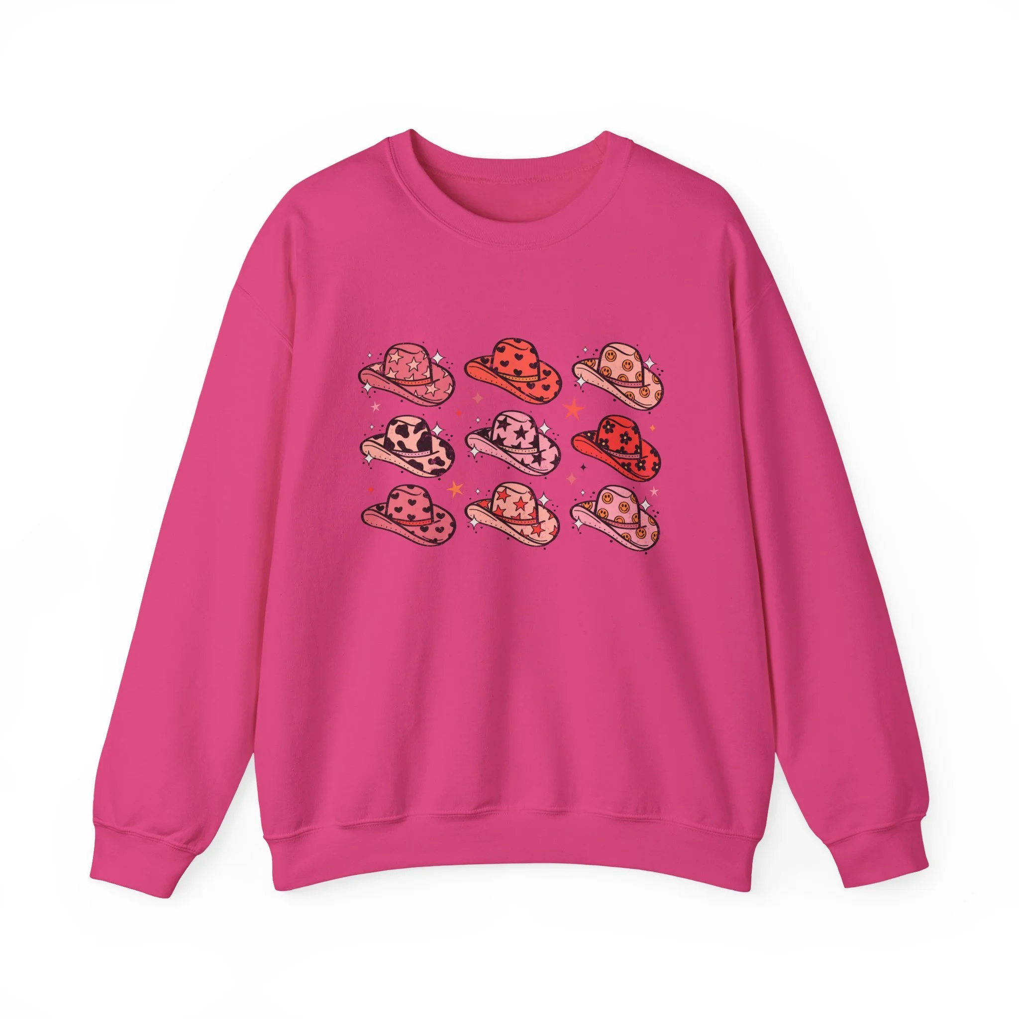 Cowboy Hat Pattern Crewneck Sweatshirt — Pink Western Hat Grid Design