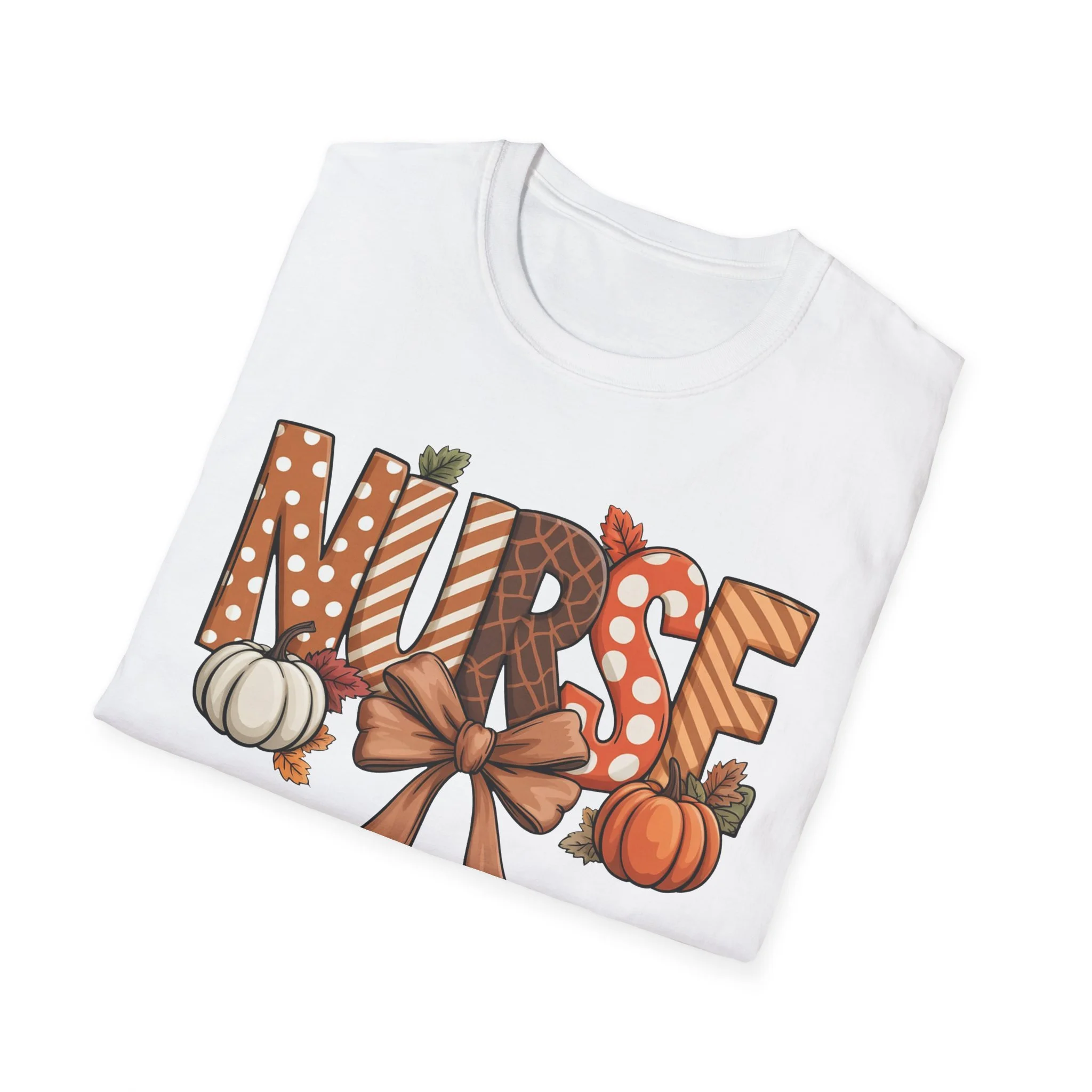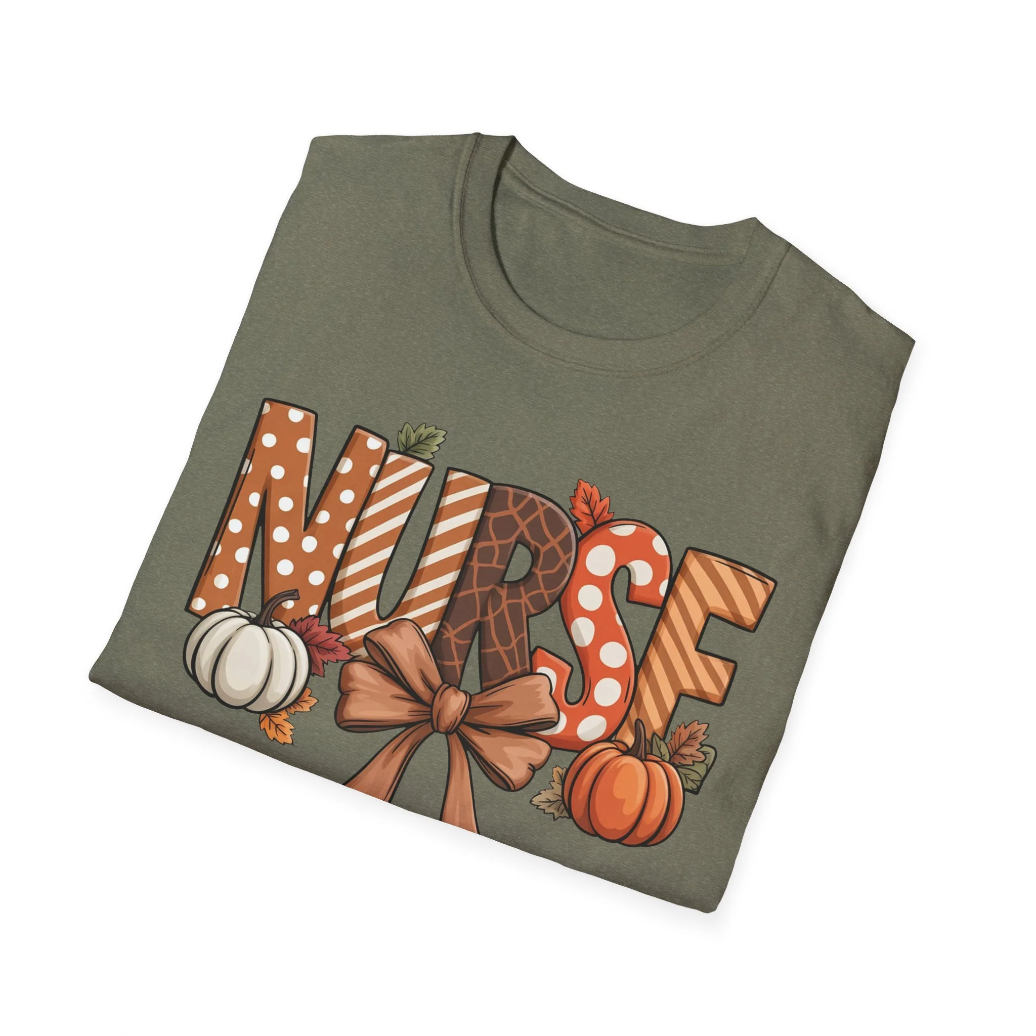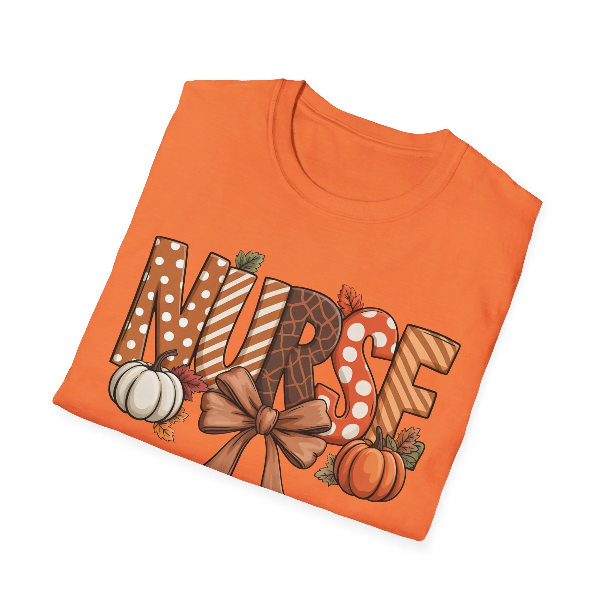Experience ultimate comfort and style with this Unisex Softstyle T-Shirt, perfect for any occasion. Made from 100% ring-spun cotton, it feels incredibly soft against your skin, making it an essential addition to your wardrobe. The unique design, featuring a charming autumnal theme with pumpkins and festive colors, radiates a cozy, inviting vibe that will brighten your day. Ideal for nurses, this tee is a thoughtful gift for those in the healthcare profession during holidays like Thanksgiving or Nurses’ Week. Its versatile fit allows for easy styling with jeans or skirts, making it suitable for casual outings, family gatherings, or cozy nights in.