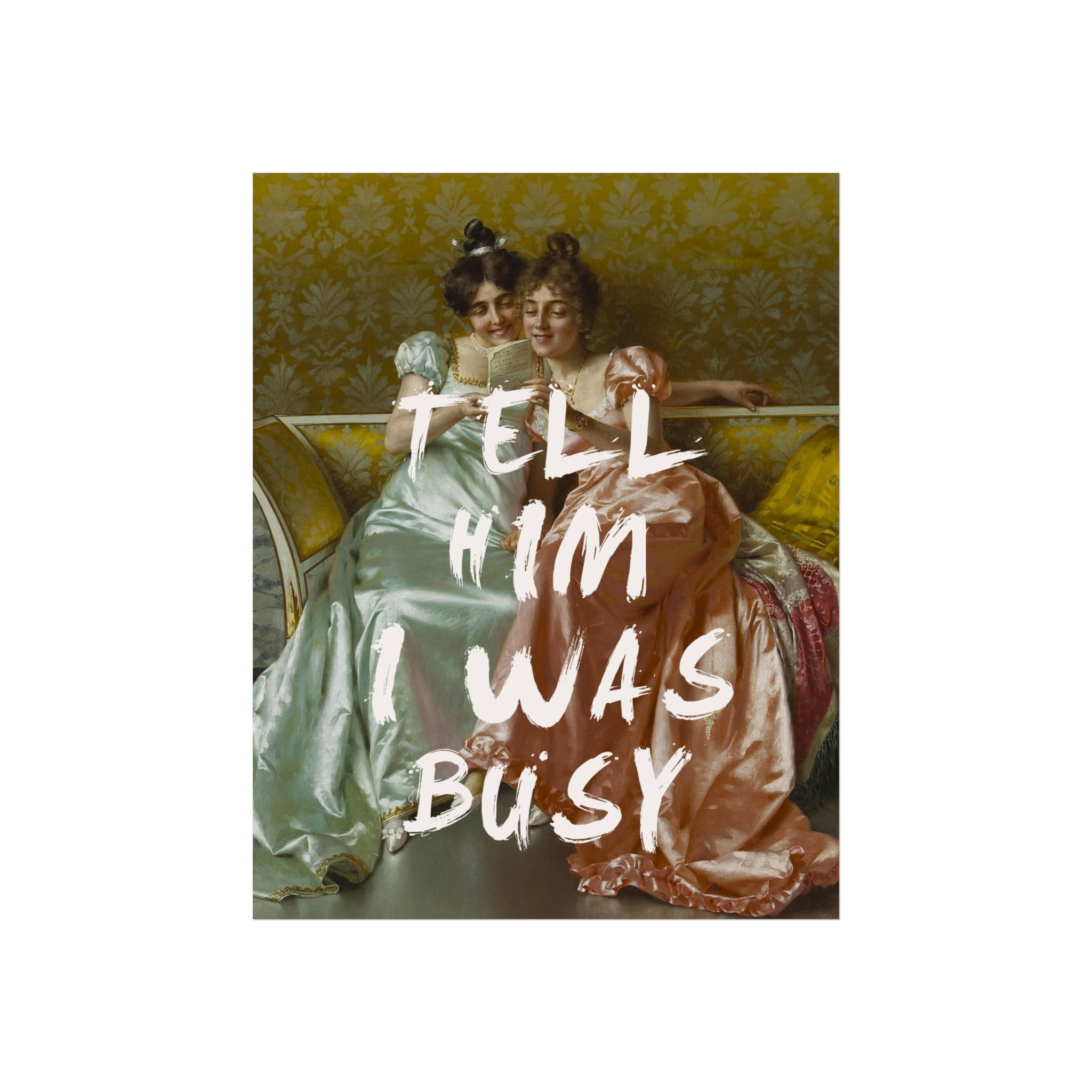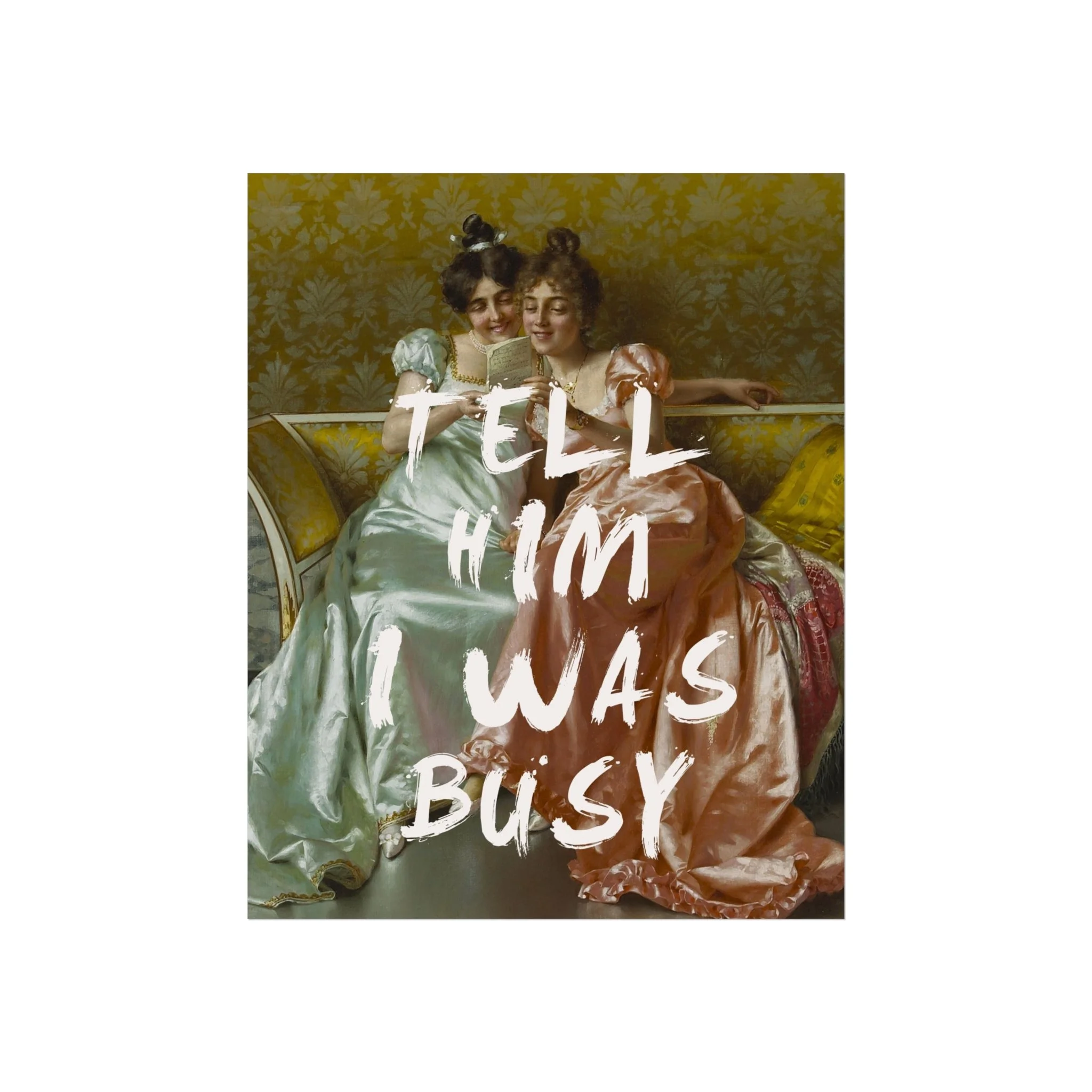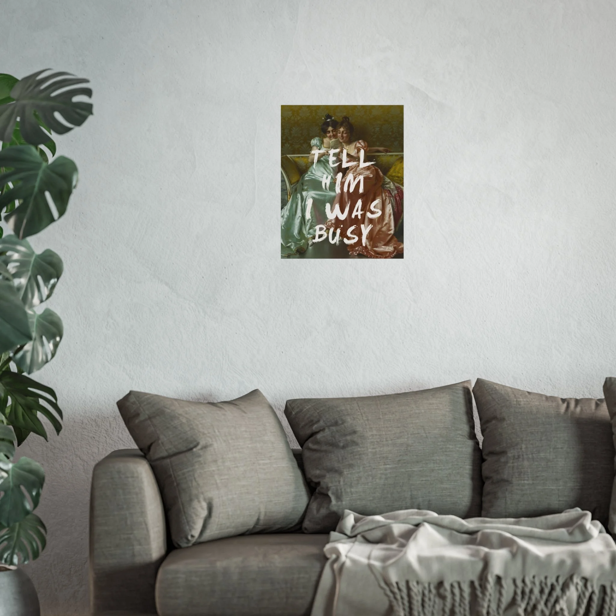 A tongue-in-cheek fine art poster that stitches classical charm to modern wit. Two Regency-era women lounge on a sumptuous sofa while bold handwritten lettering declares, “TELL HIM I WAS BUSY.” The contrast between the elegant painting and the playful message creates a sly, conversational piece that brings personality to a living room, studio wall, or hallway. Printed with archival giclée quality on museum-grade matte paper, the image holds rich color and delicate detail without glare. Choose from multiple orientations and sizes to fit gallery walls or cozy nooks — this print reads like a private joke for those who love art history with attitude.
