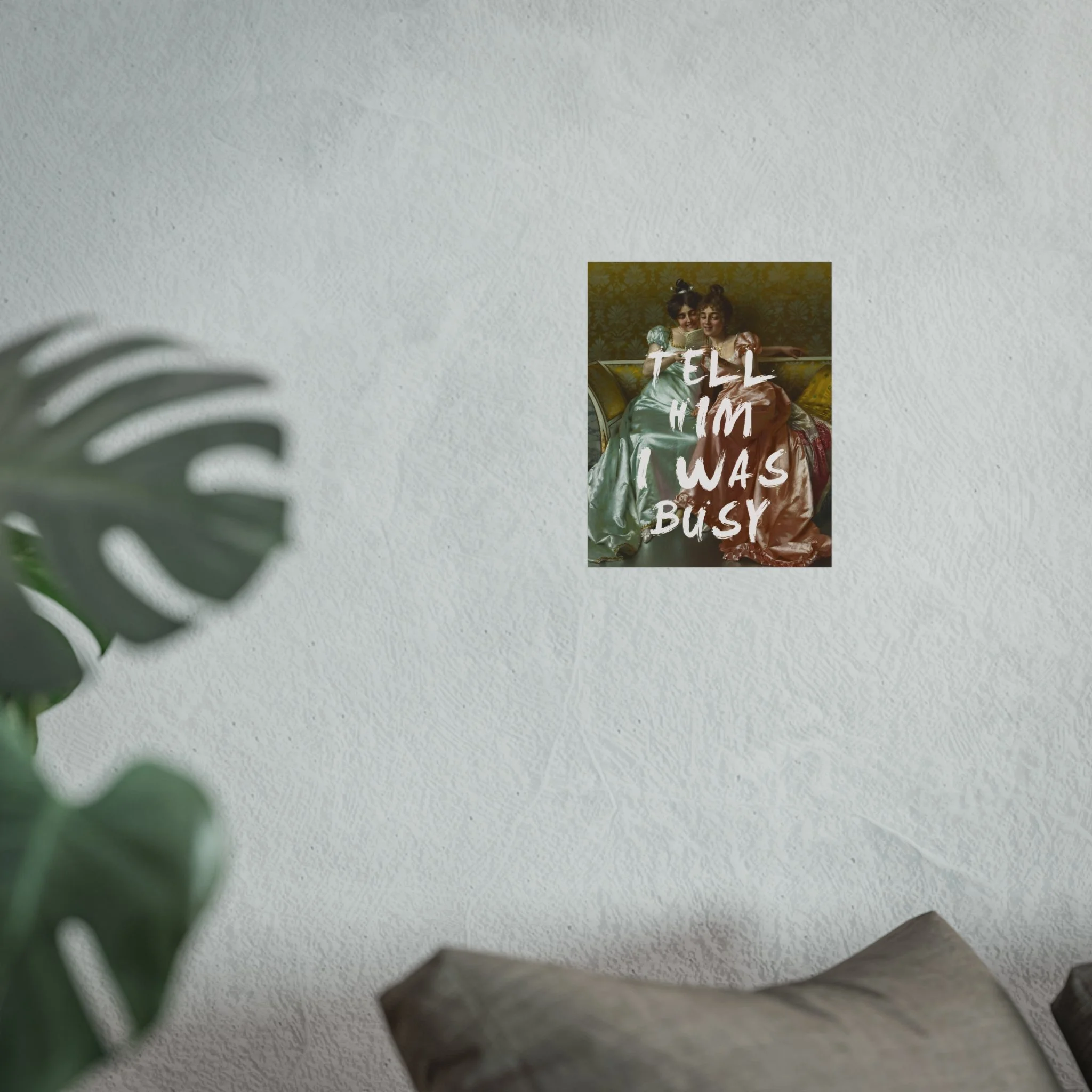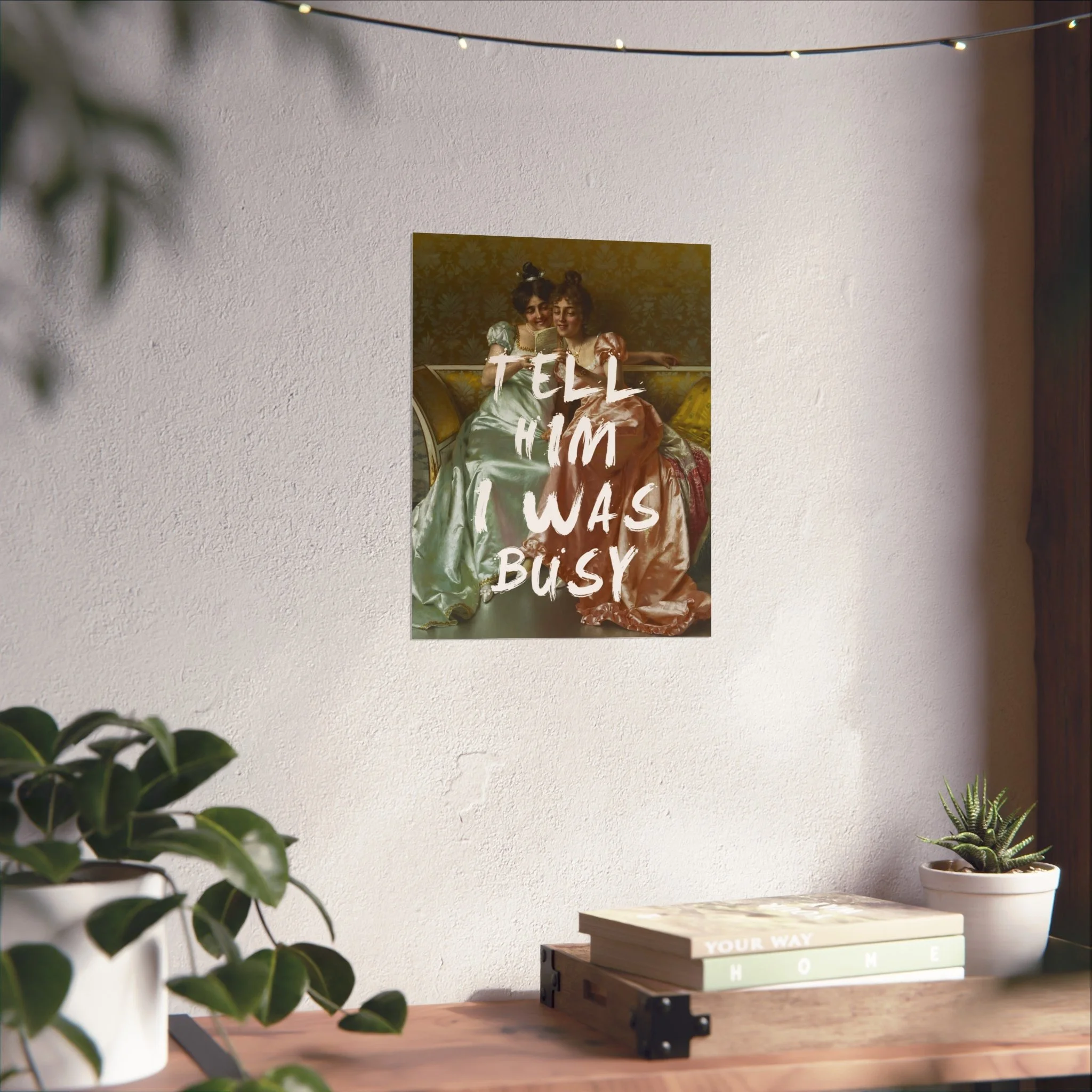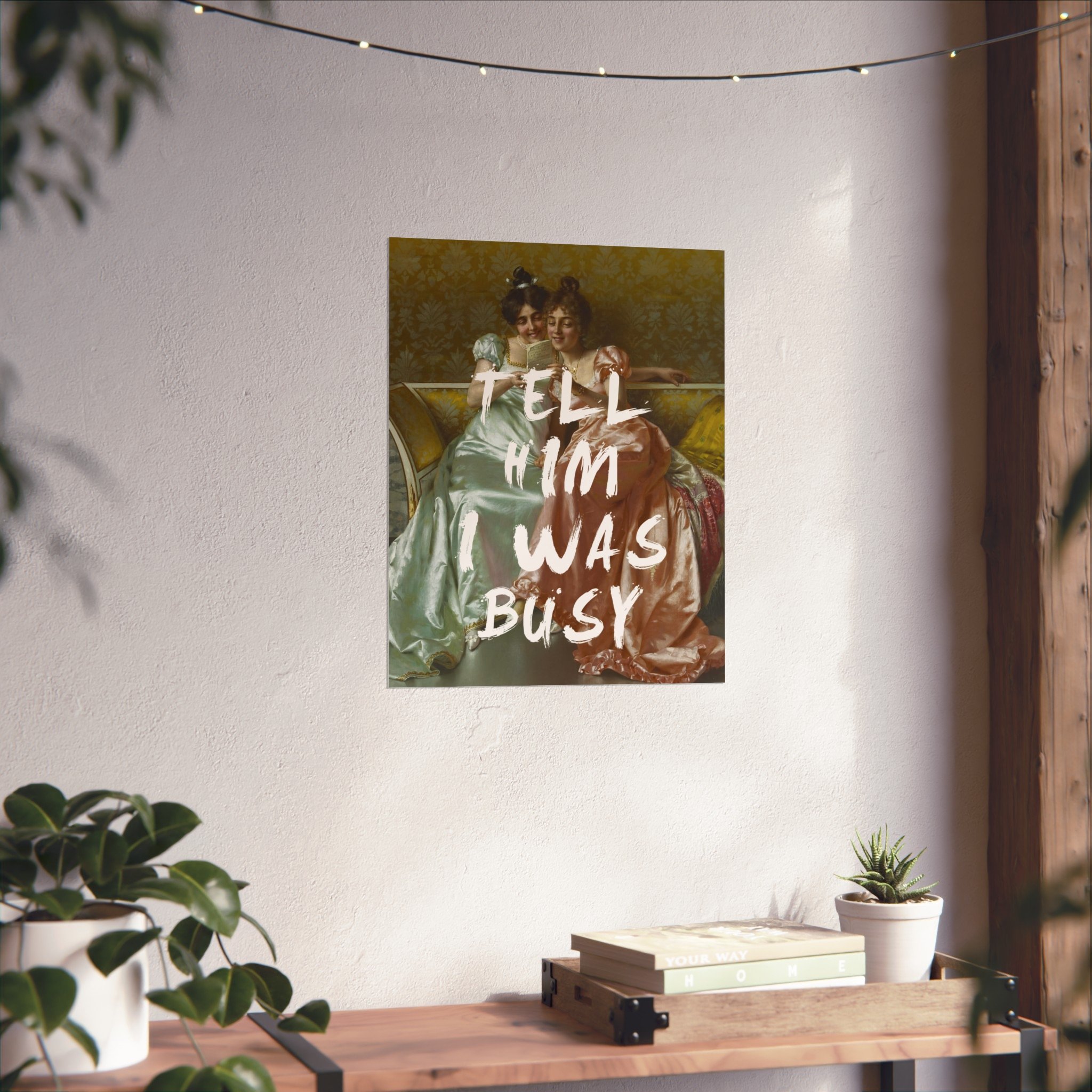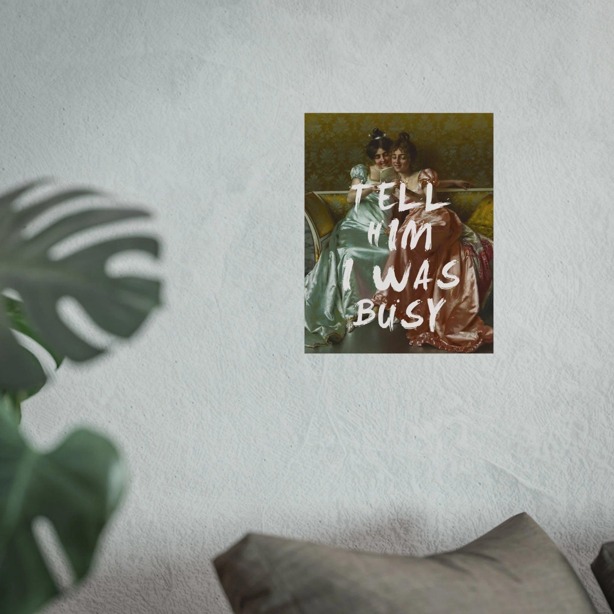A tongue-in-cheek fine art poster that stitches classical charm to modern wit. Two Regency-era women lounge on a sumptuous sofa while bold handwritten lettering declares, “TELL HIM I WAS BUSY.” The contrast between the elegant painting and the playful message creates a sly, conversational piece that brings personality to a living room, studio wall, or hallway. Printed with archival giclée quality on museum-grade matte paper, the image holds rich color and delicate detail without glare. Choose from multiple orientations and sizes to fit gallery walls or cozy nooks — this print reads like a private joke for those who love art history with attitude.