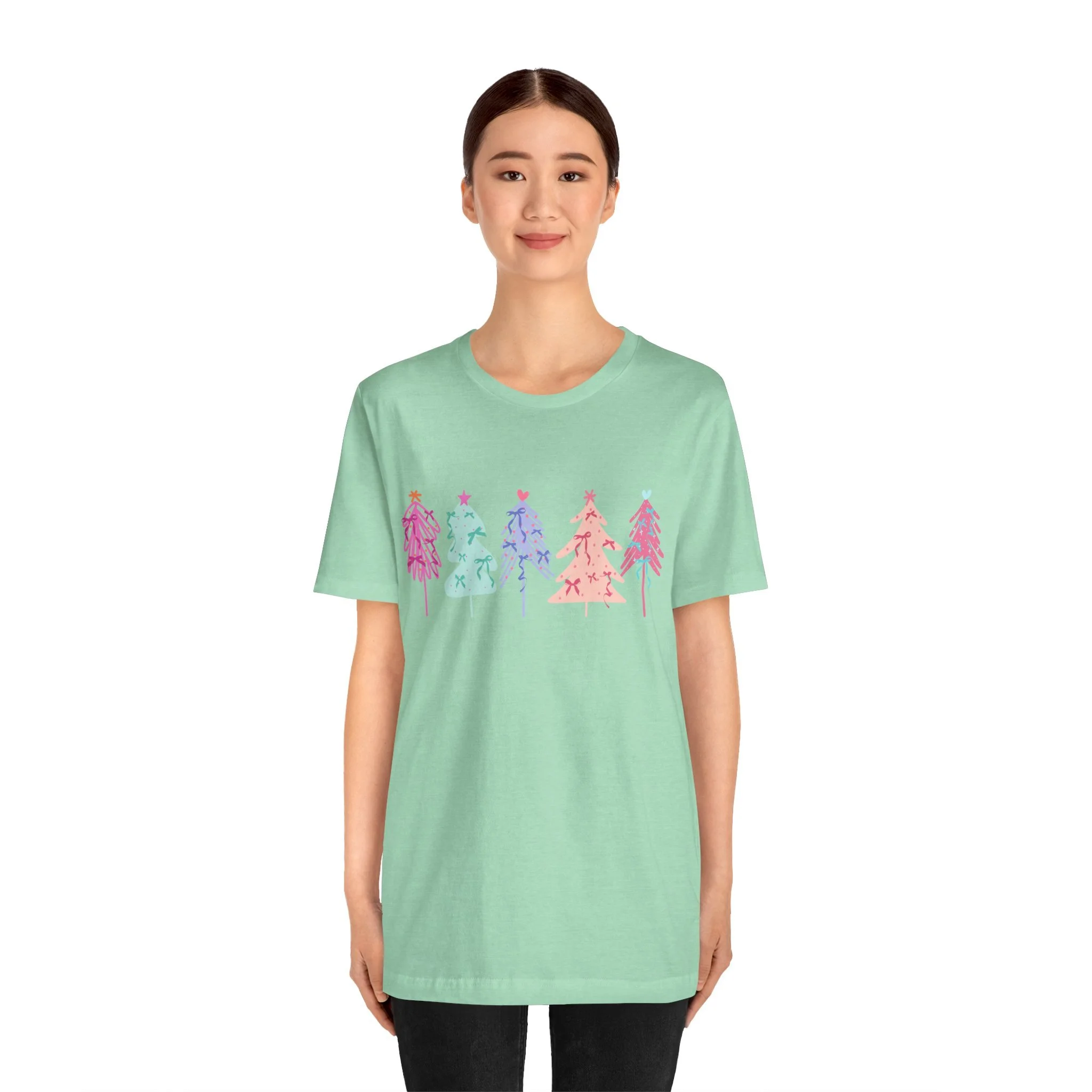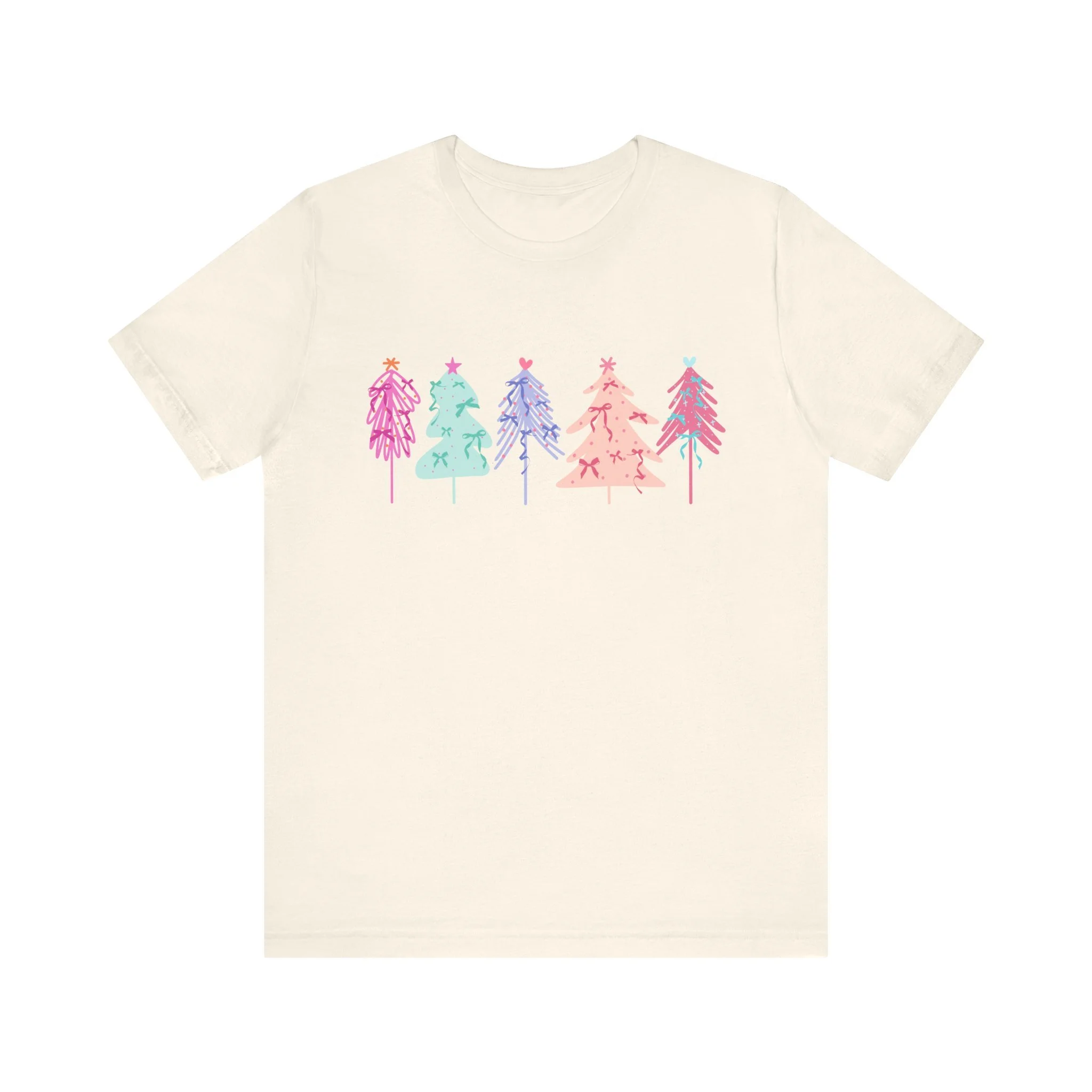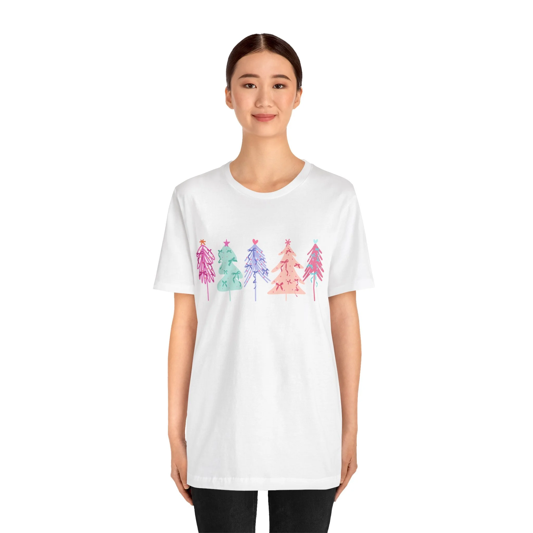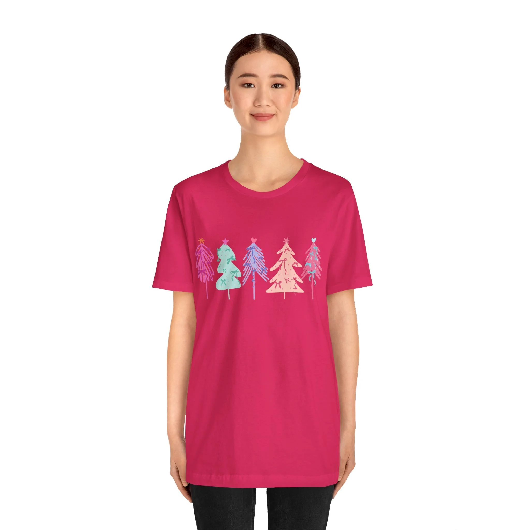Elevate your wardrobe with this stylish Unisex Jersey Short Sleeve Tee. Crafted with 100% Airlume combed and ring-spun cotton, it offers a lightweight and breathable feel, perfect for warm days or layering in cooler weather. The vibrant and playful design features colorful holiday trees, bringing a festive vibe to your look. Ideal for casual outings or semi-formal gatherings, this tee fits seamlessly into the lives of trendsetters, holiday lovers, and eco-conscious shoppers alike. Celebrate the joy of the season, whether you're lounging at home or attending a holiday party. This tee is a great gift for friends and family during Christmas or festive celebrations, ensuring that everyone can spread a little cheer in style.
