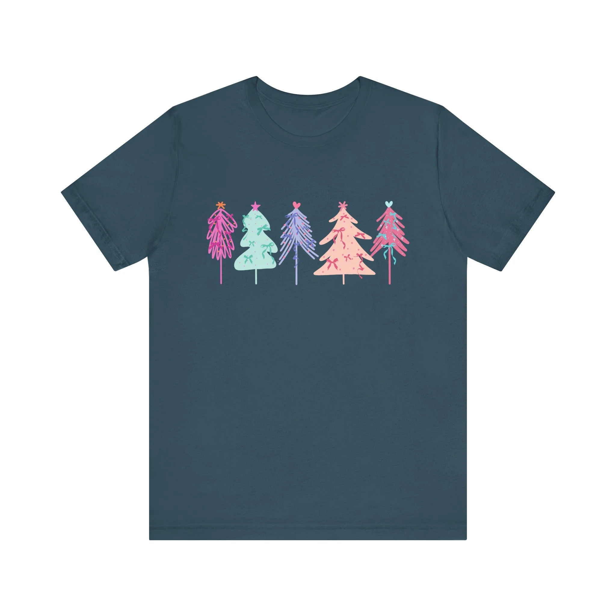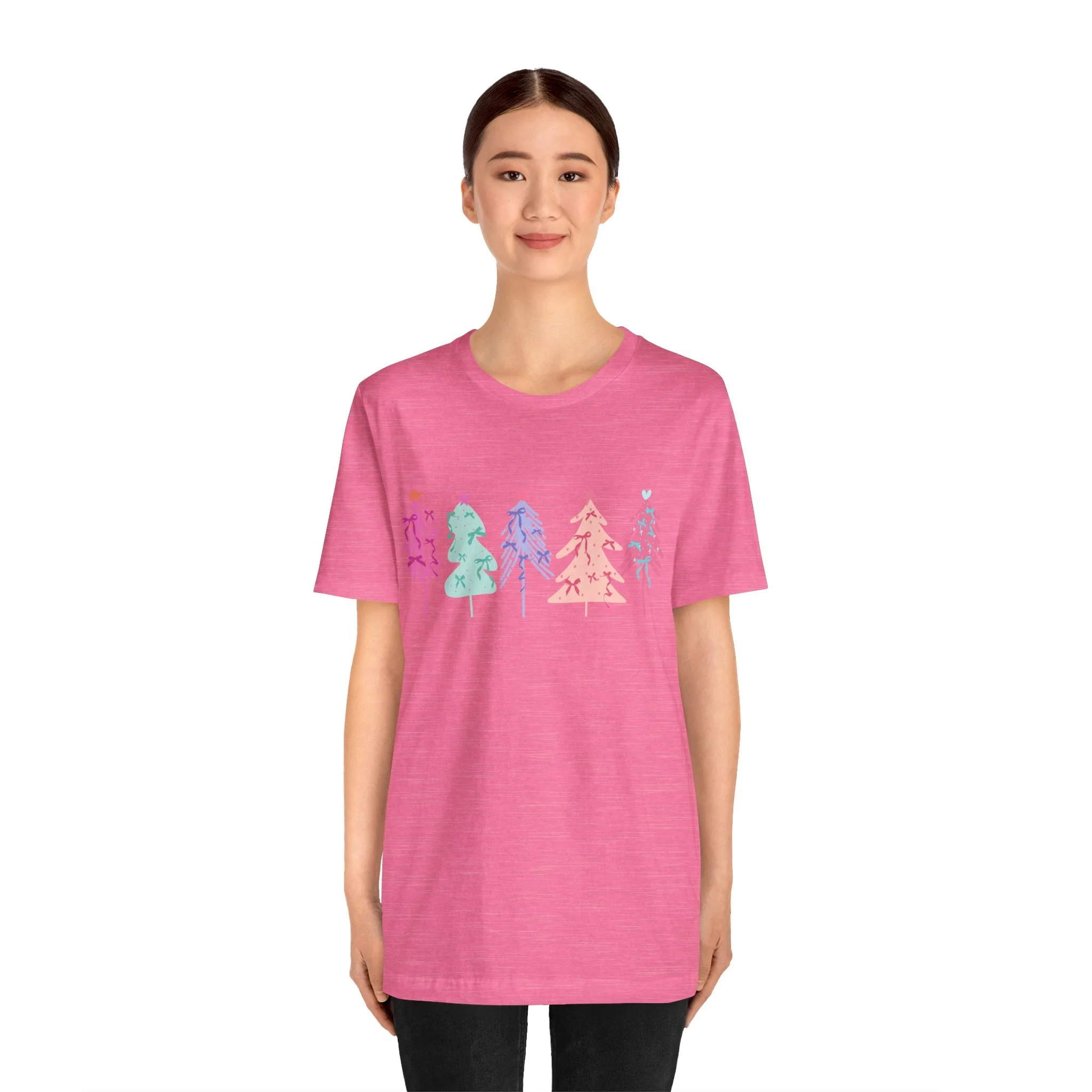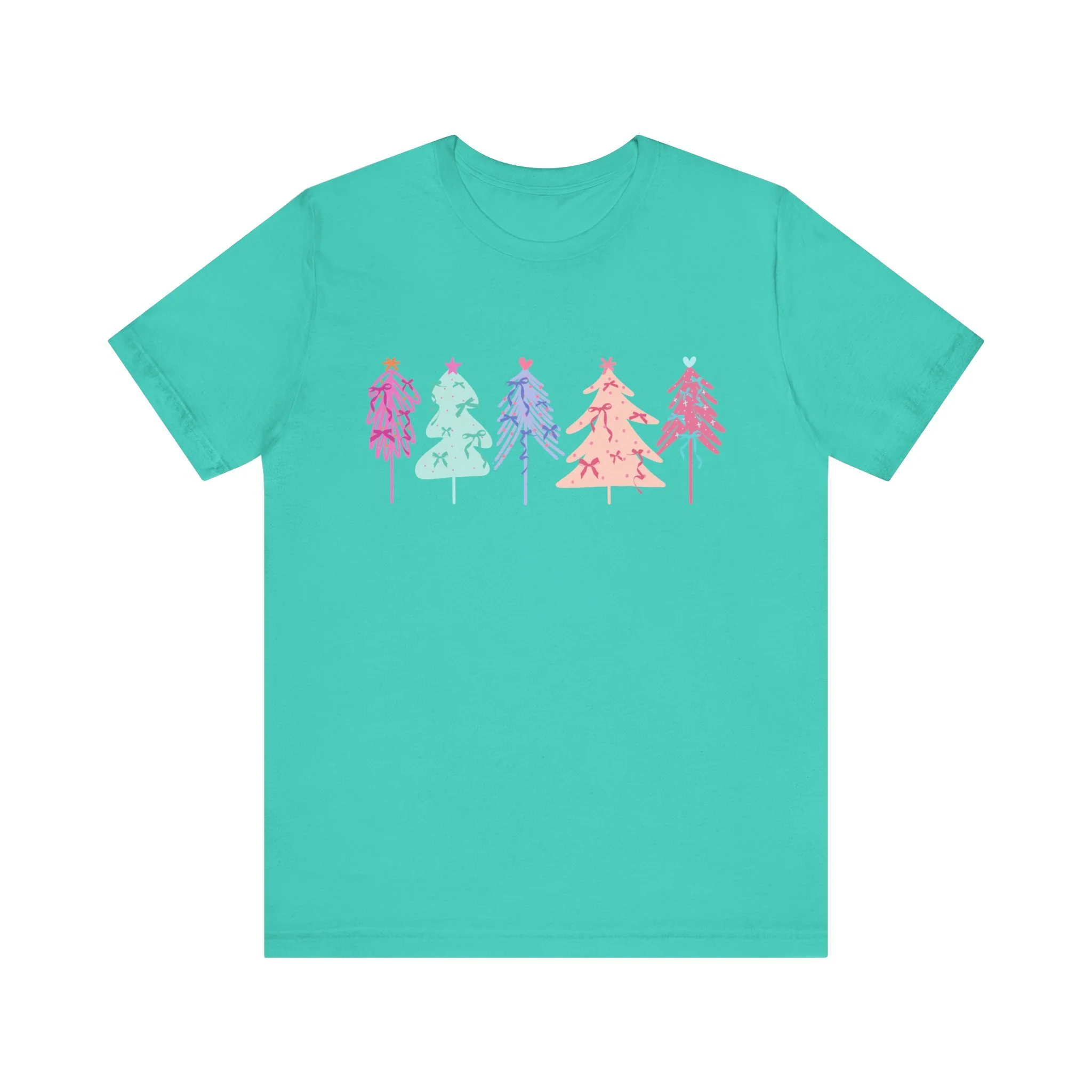 Elevate your wardrobe with this stylish Unisex Jersey Short Sleeve Tee. Crafted with 100% Airlume combed and ring-spun cotton, it offers a lightweight and breathable feel, perfect for warm days or layering in cooler weather. The vibrant and playful design features colorful holiday trees, bringing a festive vibe to your look. Ideal for casual outings or semi-formal gatherings, this tee fits seamlessly into the lives of trendsetters, holiday lovers, and eco-conscious shoppers alike. Celebrate the joy of the season, whether you're lounging at home or attending a holiday party. This tee is a great gift for friends and family during Christmas or festive celebrations, ensuring that everyone can spread a little cheer in style.