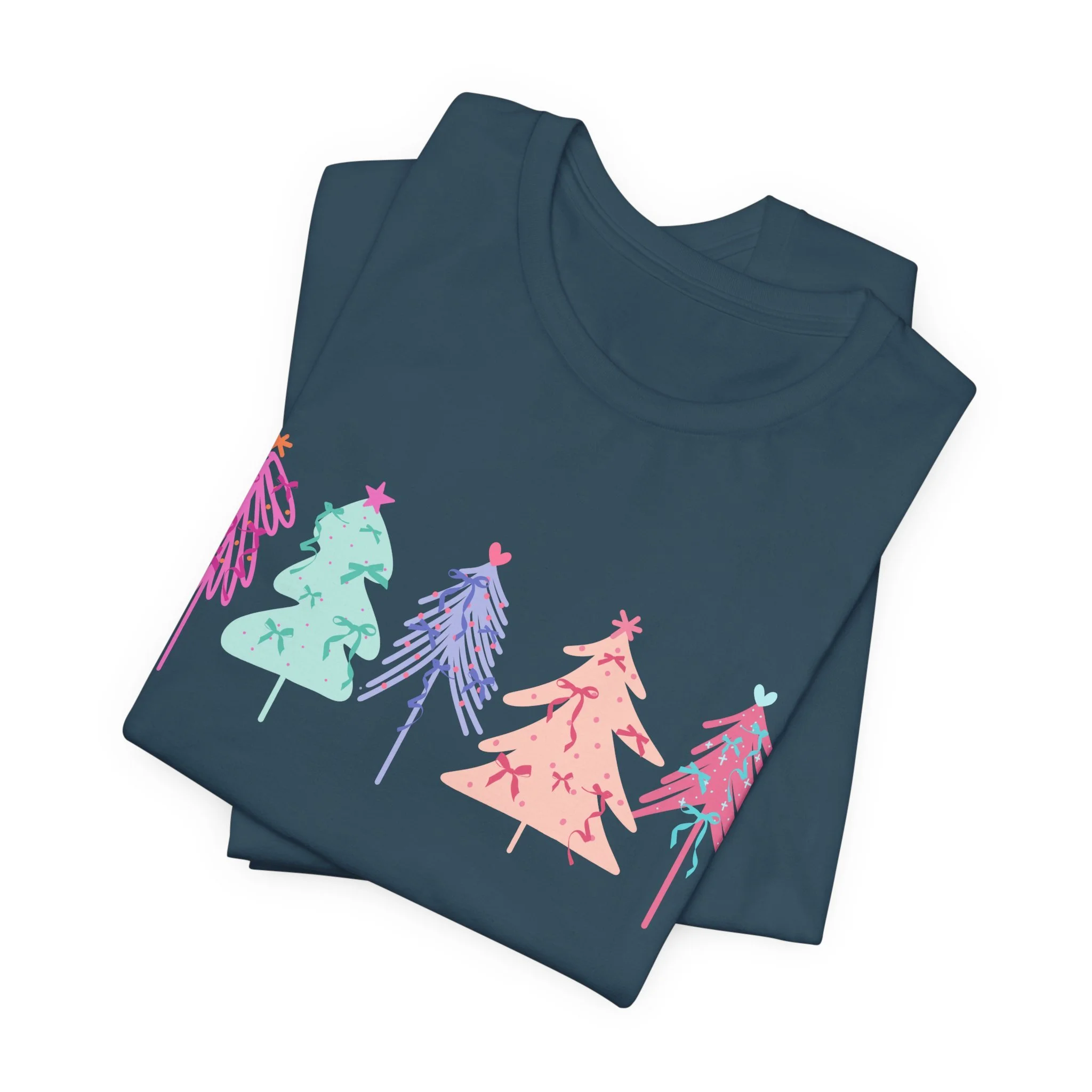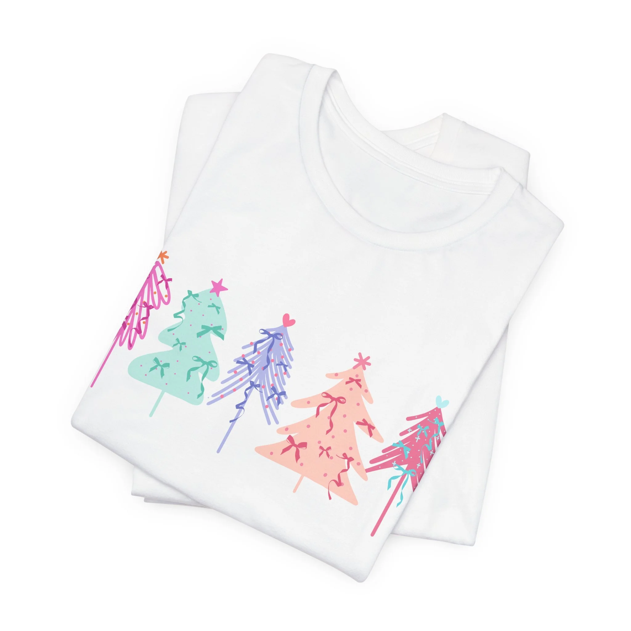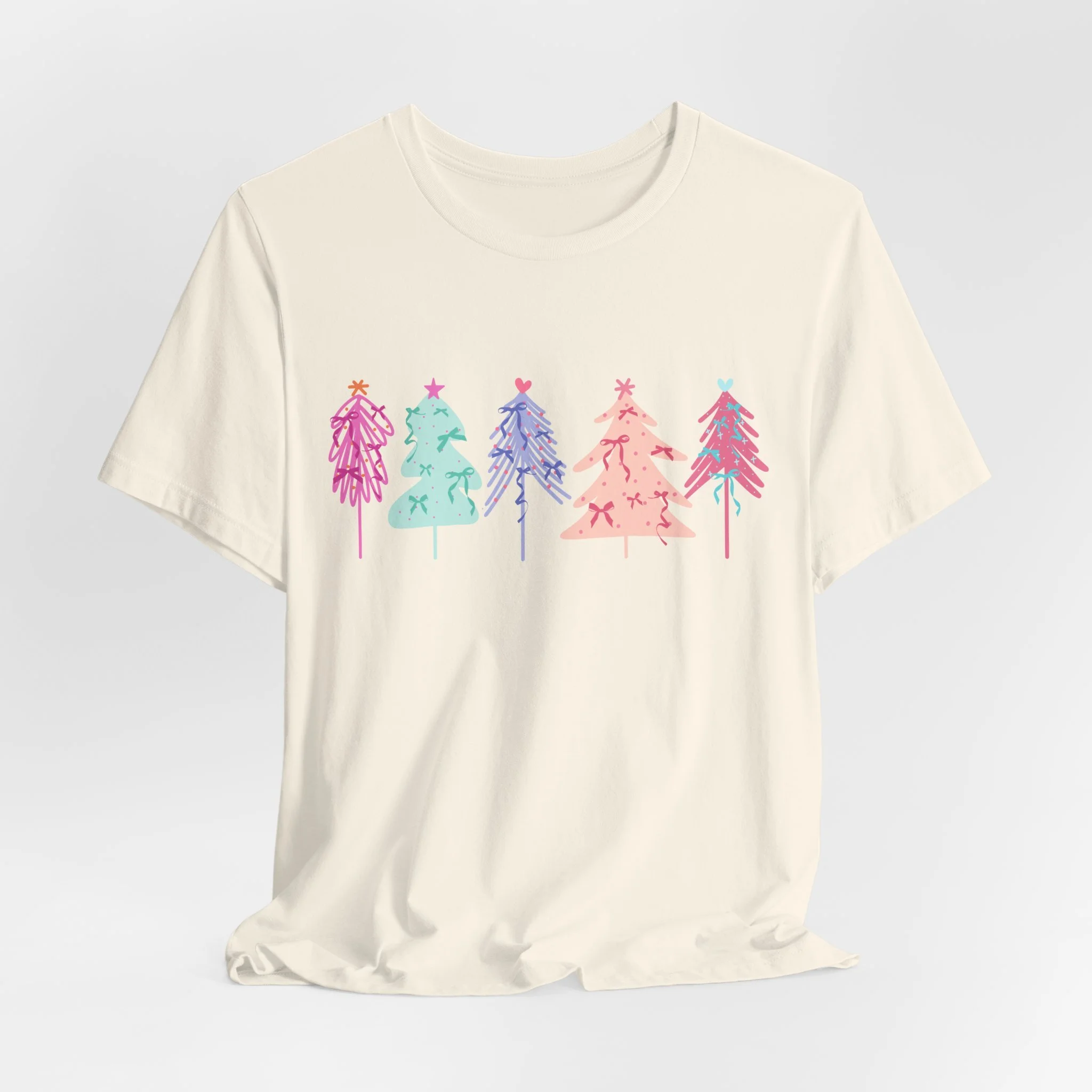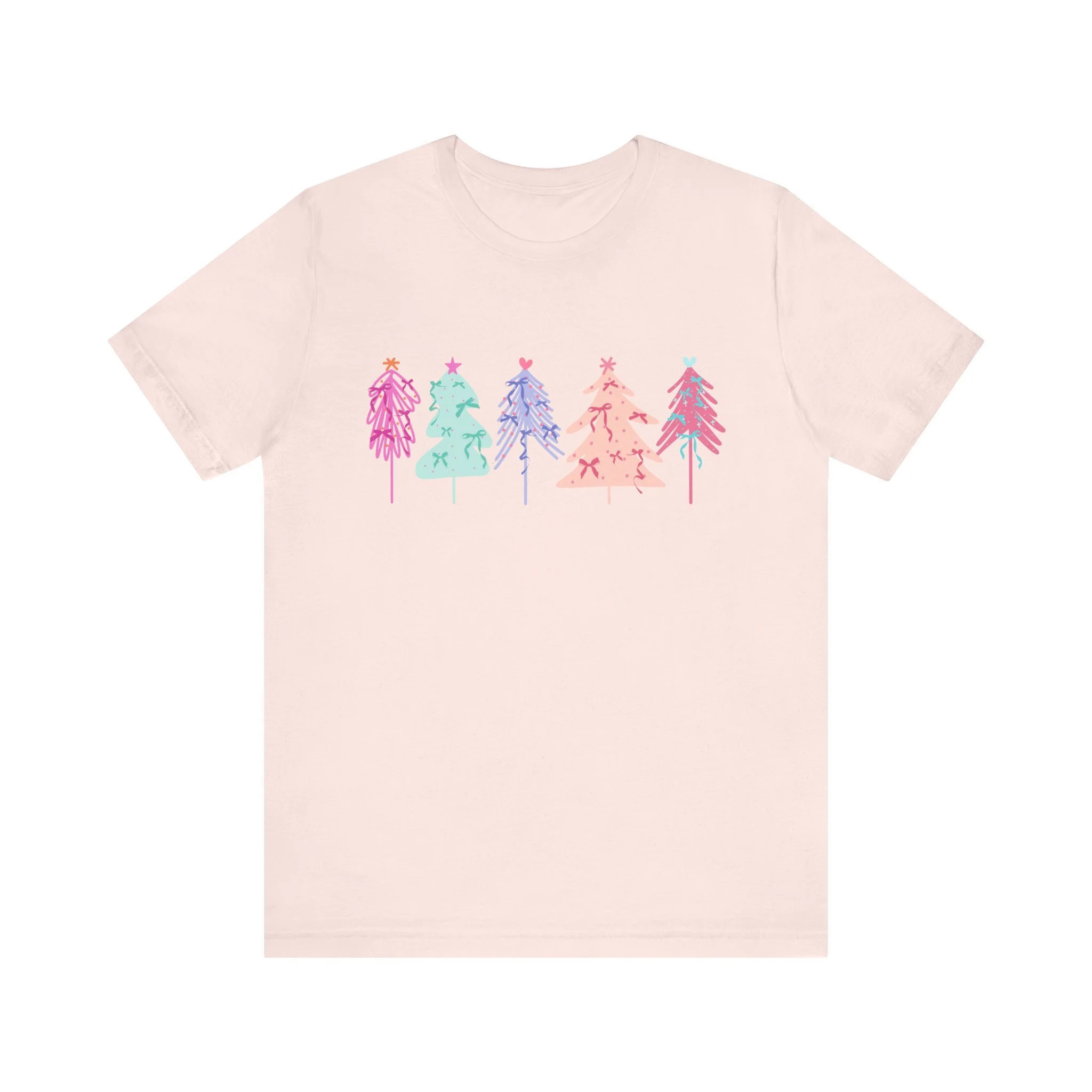 Elevate your wardrobe with this stylish Unisex Jersey Short Sleeve Tee. Crafted with 100% Airlume combed and ring-spun cotton, it offers a lightweight and breathable feel, perfect for warm days or layering in cooler weather. The vibrant and playful design features colorful holiday trees, bringing a festive vibe to your look. Ideal for casual outings or semi-formal gatherings, this tee fits seamlessly into the lives of trendsetters, holiday lovers, and eco-conscious shoppers alike. Celebrate the joy of the season, whether you're lounging at home or attending a holiday party. This tee is a great gift for friends and family during Christmas or festive celebrations, ensuring that everyone can spread a little cheer in style.