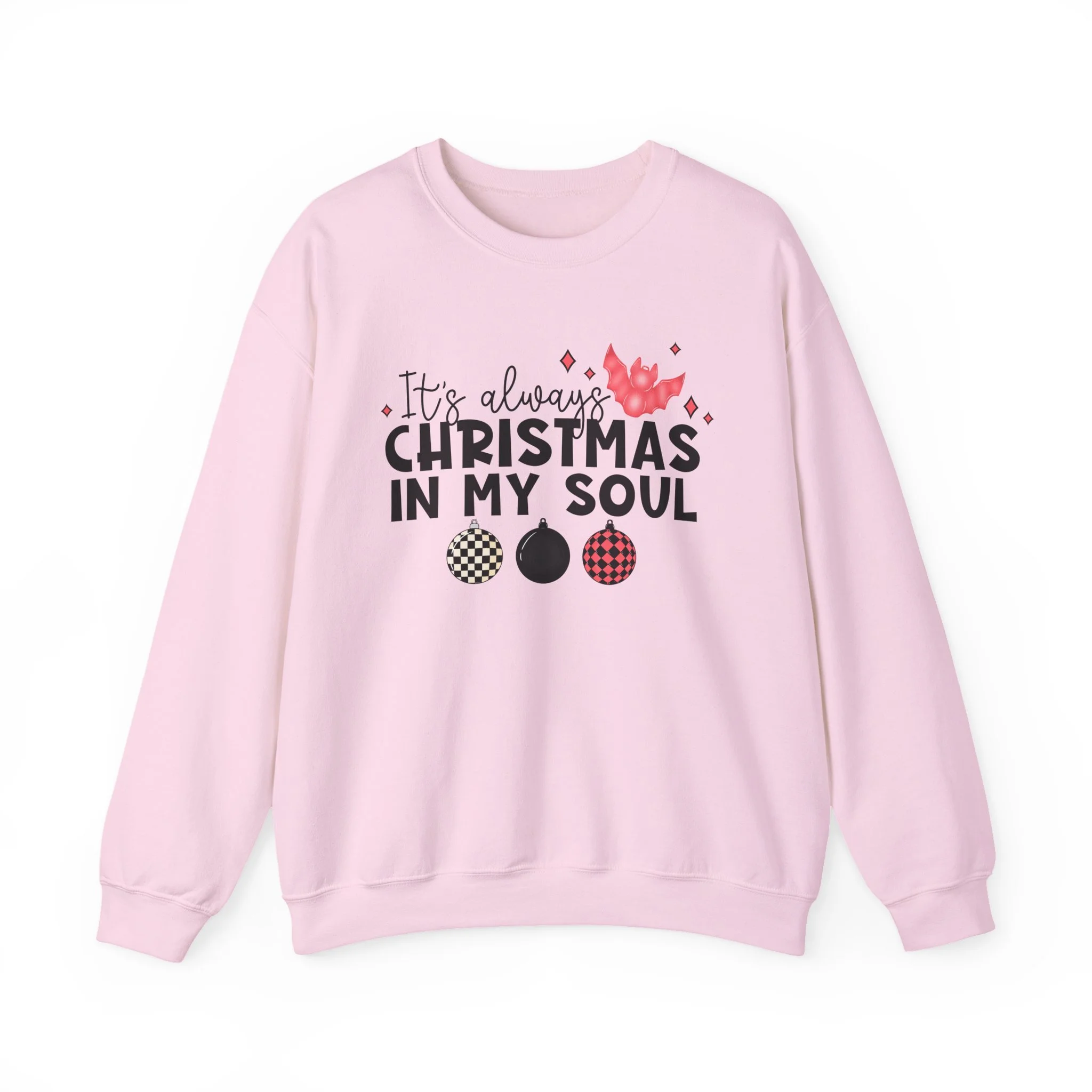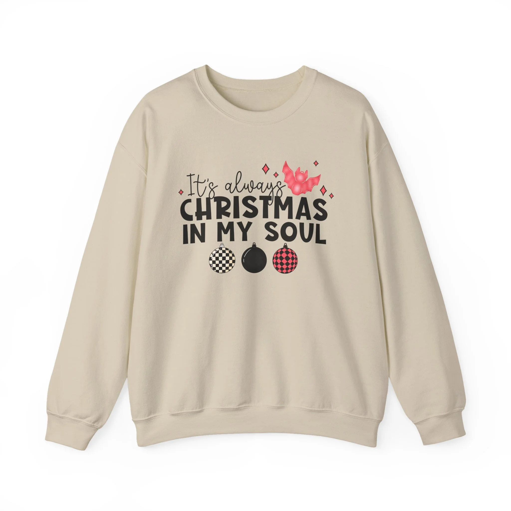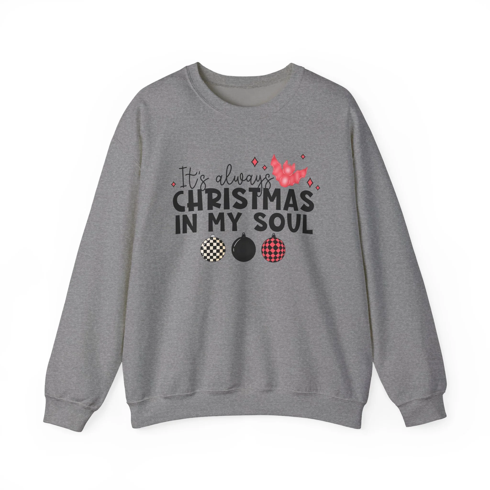 Experience the warmth and comfort of this unisex heavy blend crewneck sweatshirt, perfect for cozy days at home or festive outings. Its delightful design featuring the phrase "It’s always Christmas in my soul" brings a joyful vibe, making it an ideal choice for the holiday season. Whether you're decorating your home, attending a family gathering, or simply enjoying a quiet evening, this sweatshirt adds a touch of festive cheer to your wardrobe. Crafted for adults, it's a thoughtful gift for friends and family who love the spirit of Christmas, ideal for holiday celebrations and gatherings.
