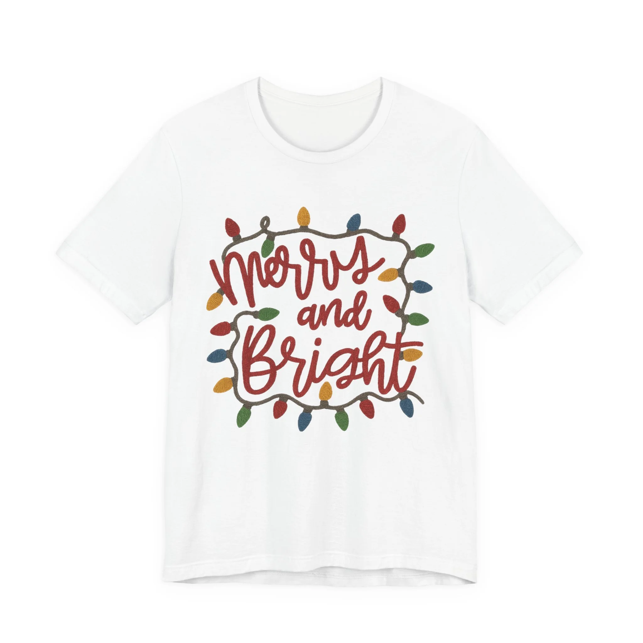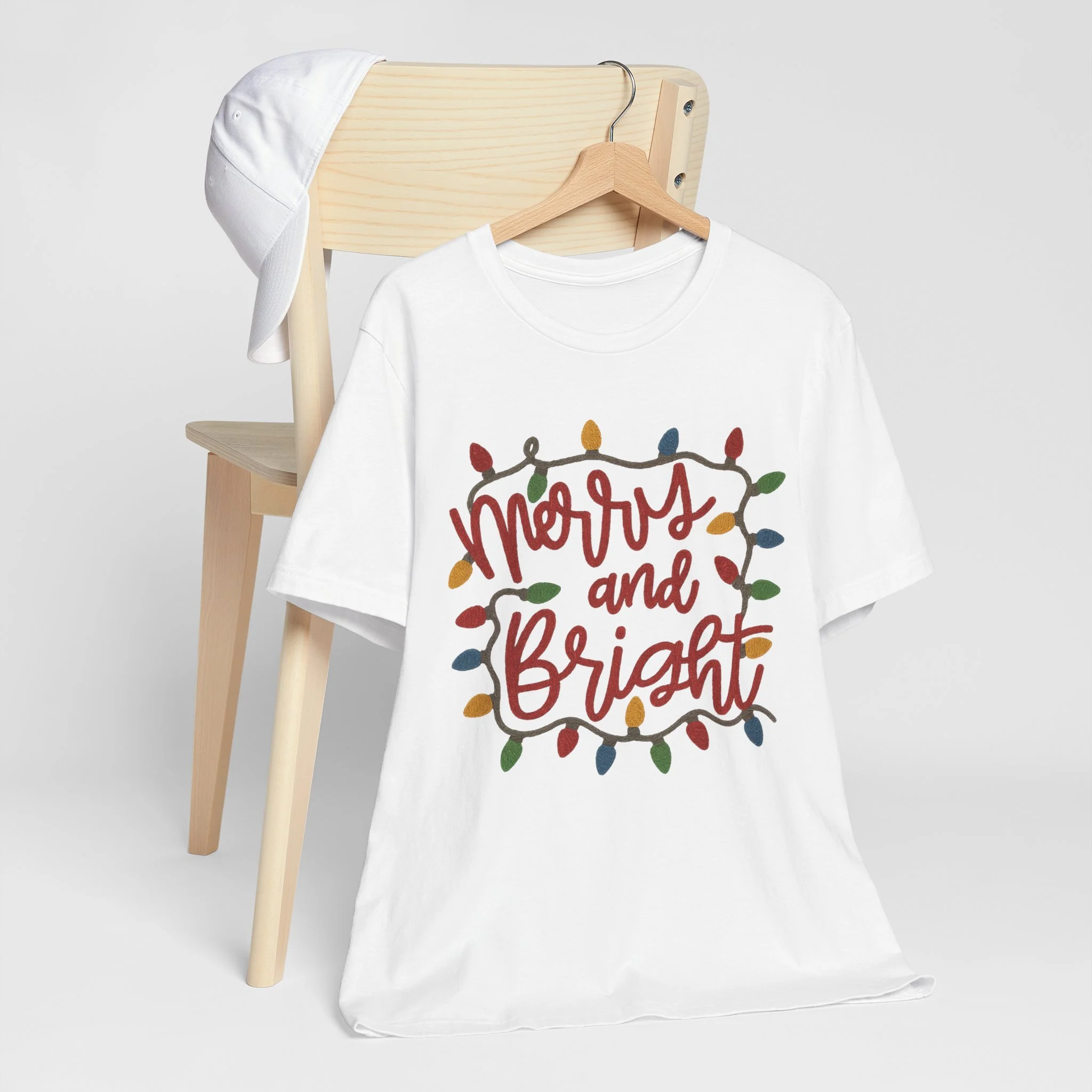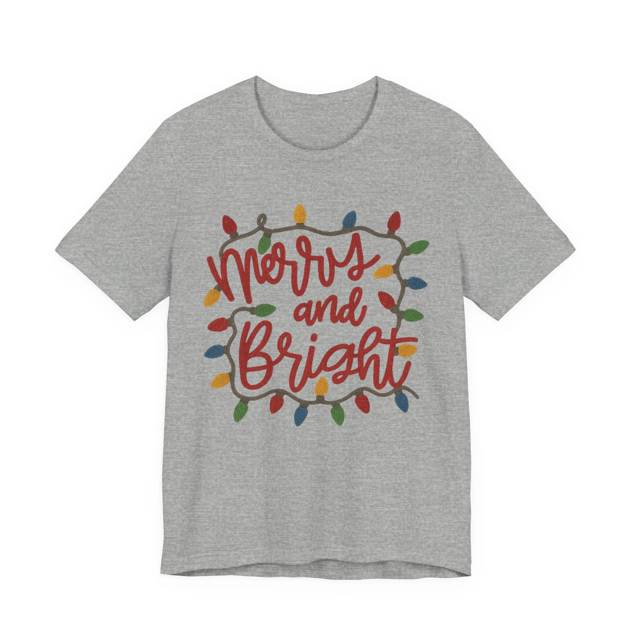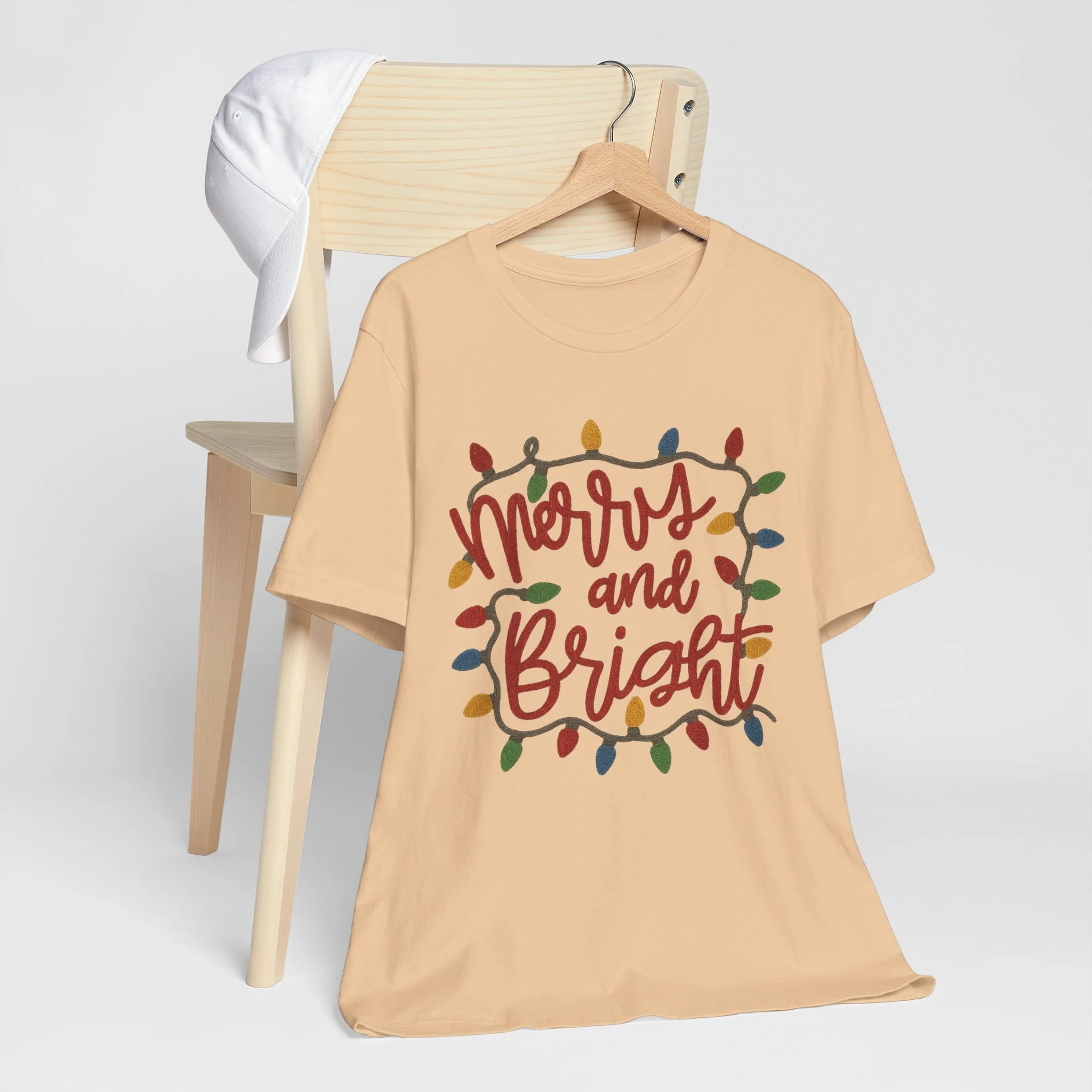 Celebrate the festive season with our charming unisex jersey short sleeve tee! This delightful shirt brings a joyful vibe, featuring a vibrant "Merry and Bright" design adorned with cheerful holiday lights. It's perfect for gatherings with family and friends, making it a wonderful addition to your holiday wardrobe. Whether you're hosting a cozy get-together or lounging at home, this tee balances comfort and style effortlessly. It's an ideal gift for anyone who loves to spread holiday cheer, suitable for Christmas, New Year celebrations, or any festive occasion. Make this tee a staple in your wardrobe this holiday season and enjoy the warmth it brings!