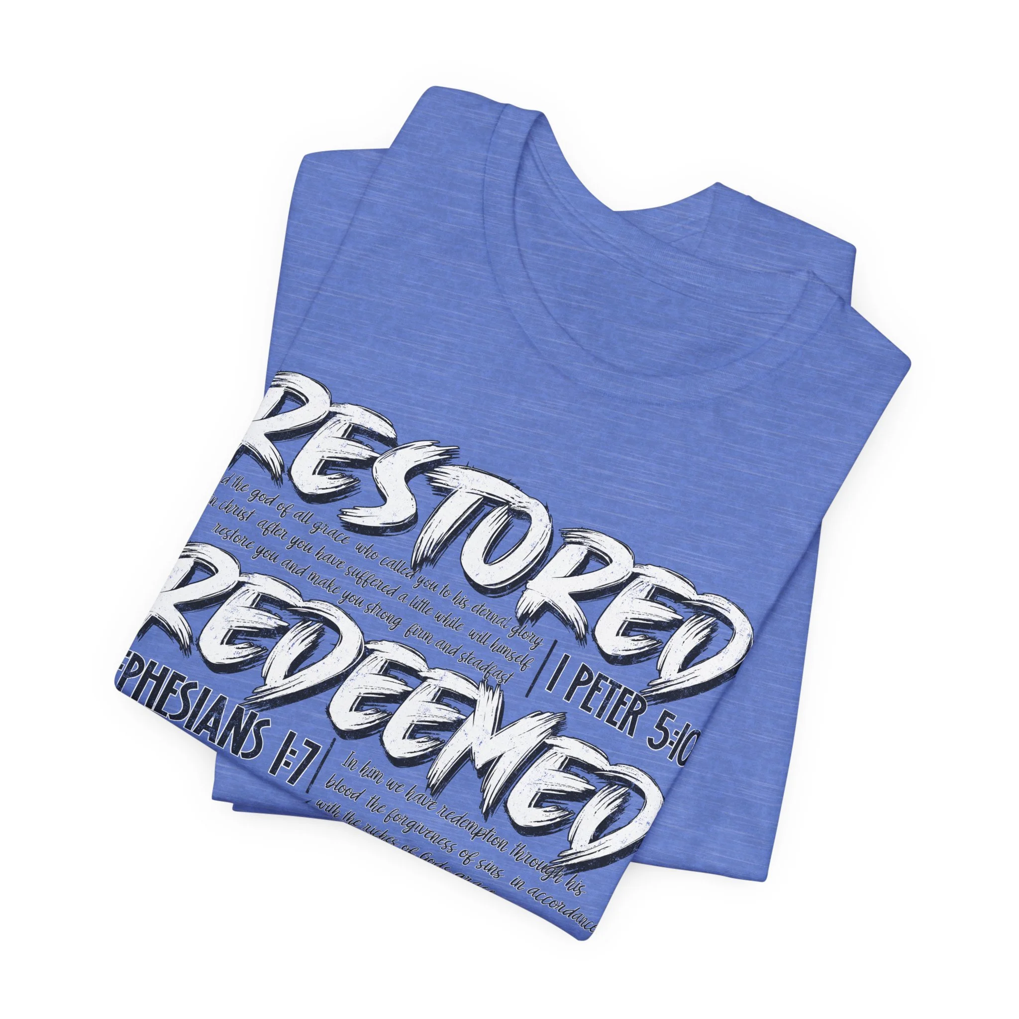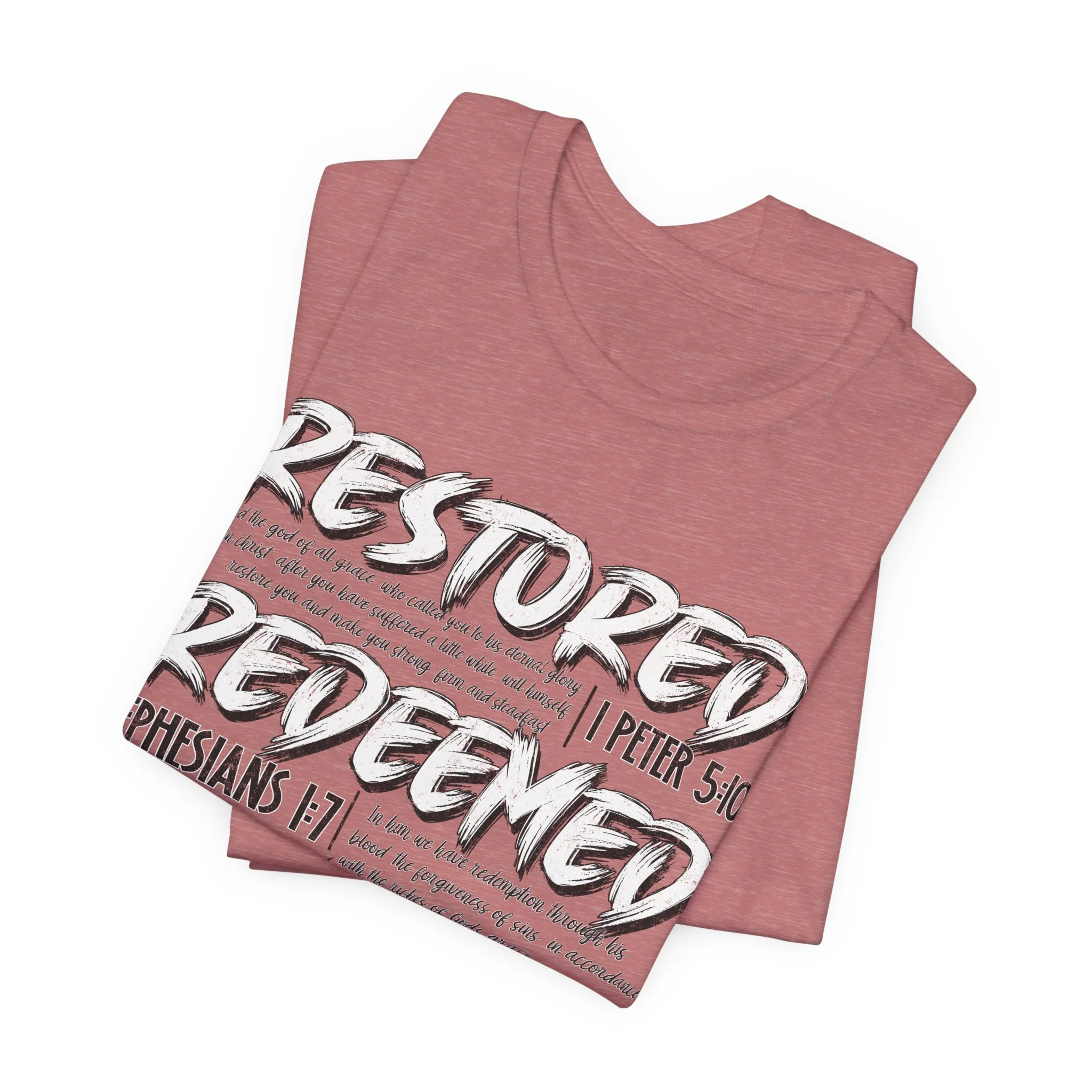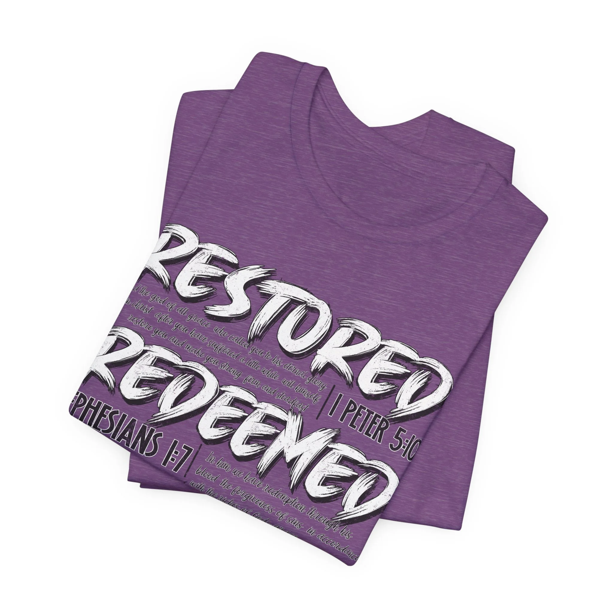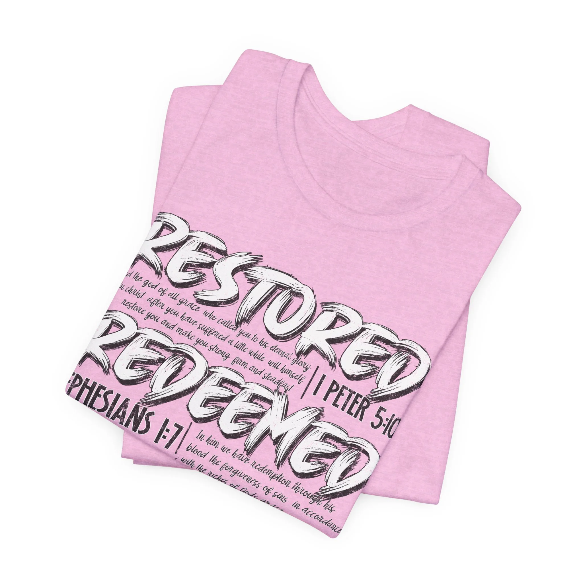 Embrace a sense of renewal with this stylish Unisex Jersey Short Sleeve Tee. Crafted from 100% Airlume combed and ring-spun cotton, this tee is perfect for layering or wearing on its own. Its lightweight fabric offers breathability and comfort, making it ideal for both casual outings and semi-formal settings. The inspirational design features themes of being restored, redeemed, and renewed, making it a thoughtful gift for those looking for motivation and positivity in their lives. This tee is perfect for religious gatherings, motivational events, or simply as an everyday reminder of personal growth. Targeting individuals who appreciate both style and spirituality, this shirt is a great fit for anyone embracing their journey. Ideal for holidays such as Easter or any celebration focusing on renewal and hope.