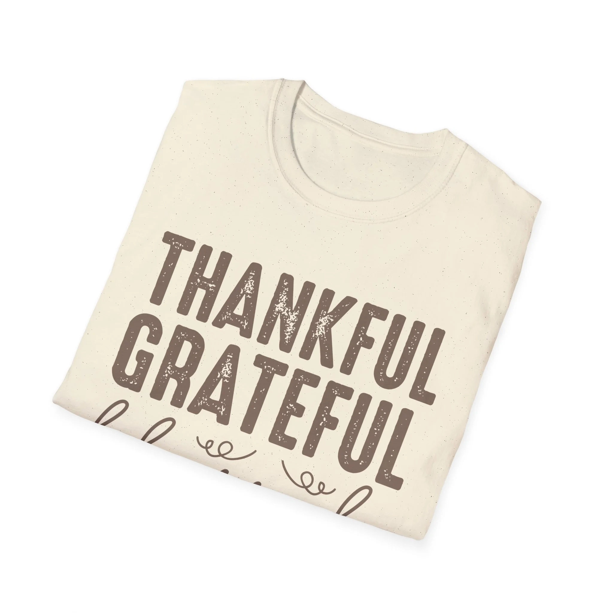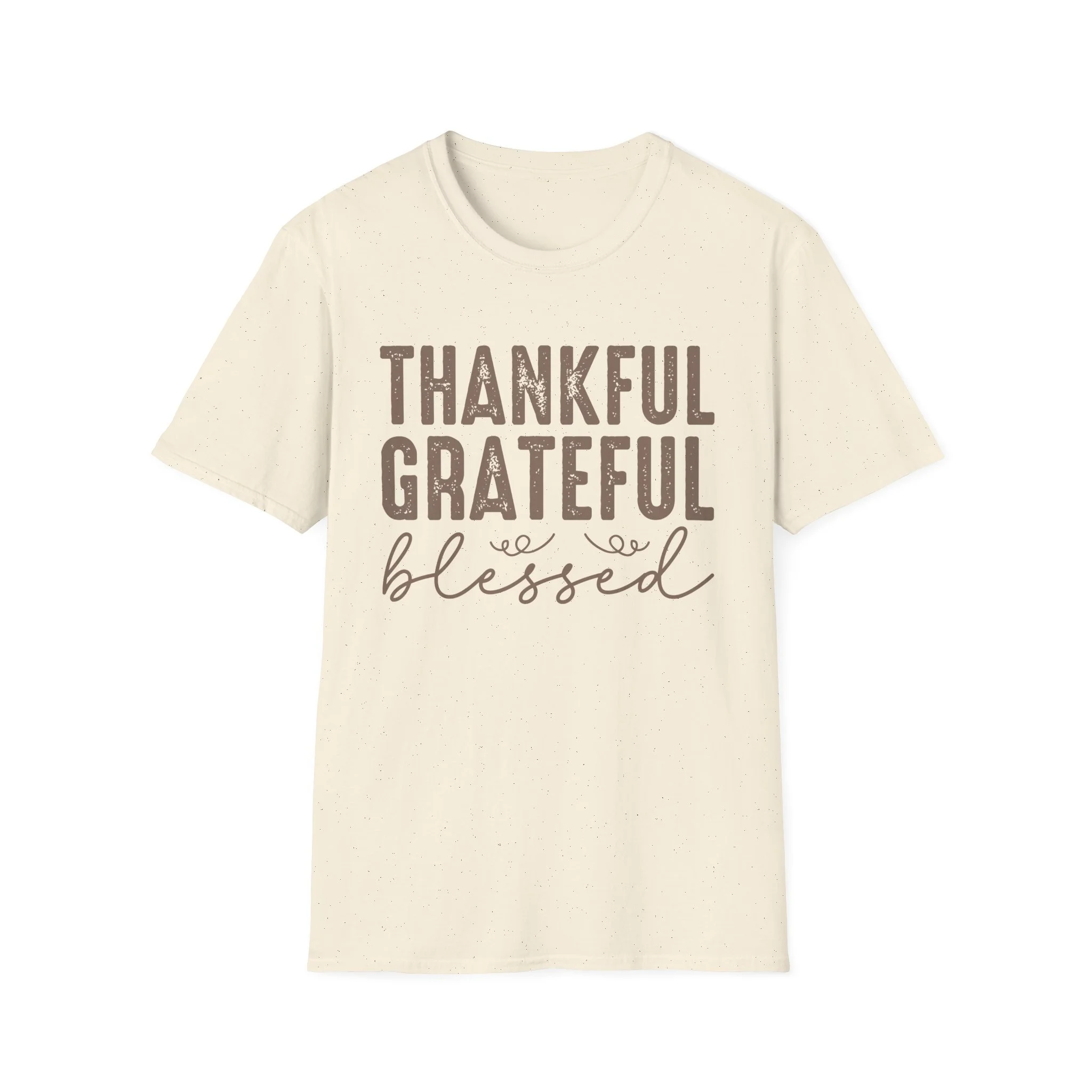 Experience comfort and style with this Unisex Softstyle T-Shirt. Perfect for everyday wear, this shirt embodies a cozy, relaxed vibe that is great for any casual occasion. The uplifting message of being 'Thankful, Grateful, Blessed' resonates with those who cherish positivity and gratitude in their lives. Whether it's for Thanksgiving, everyday celebrations, or simply as a thoughtful gift, this t-shirt is ideal for friends and family who appreciate meaningful expressions. Dress it up or down for gatherings, or wear it as a reminder to stay thankful throughout the year!