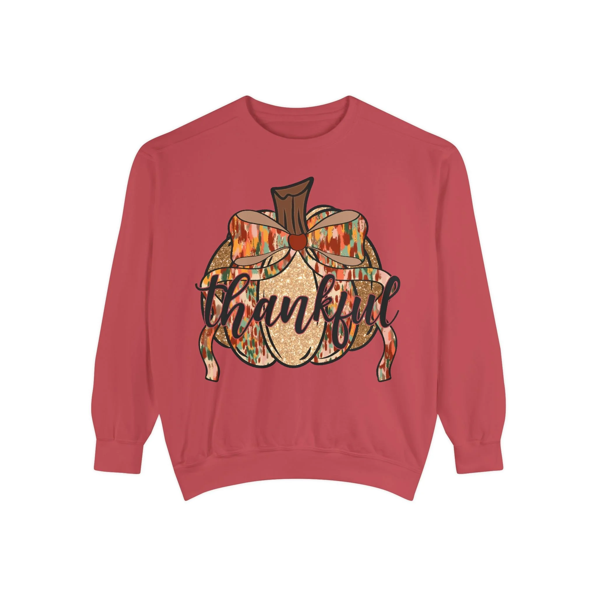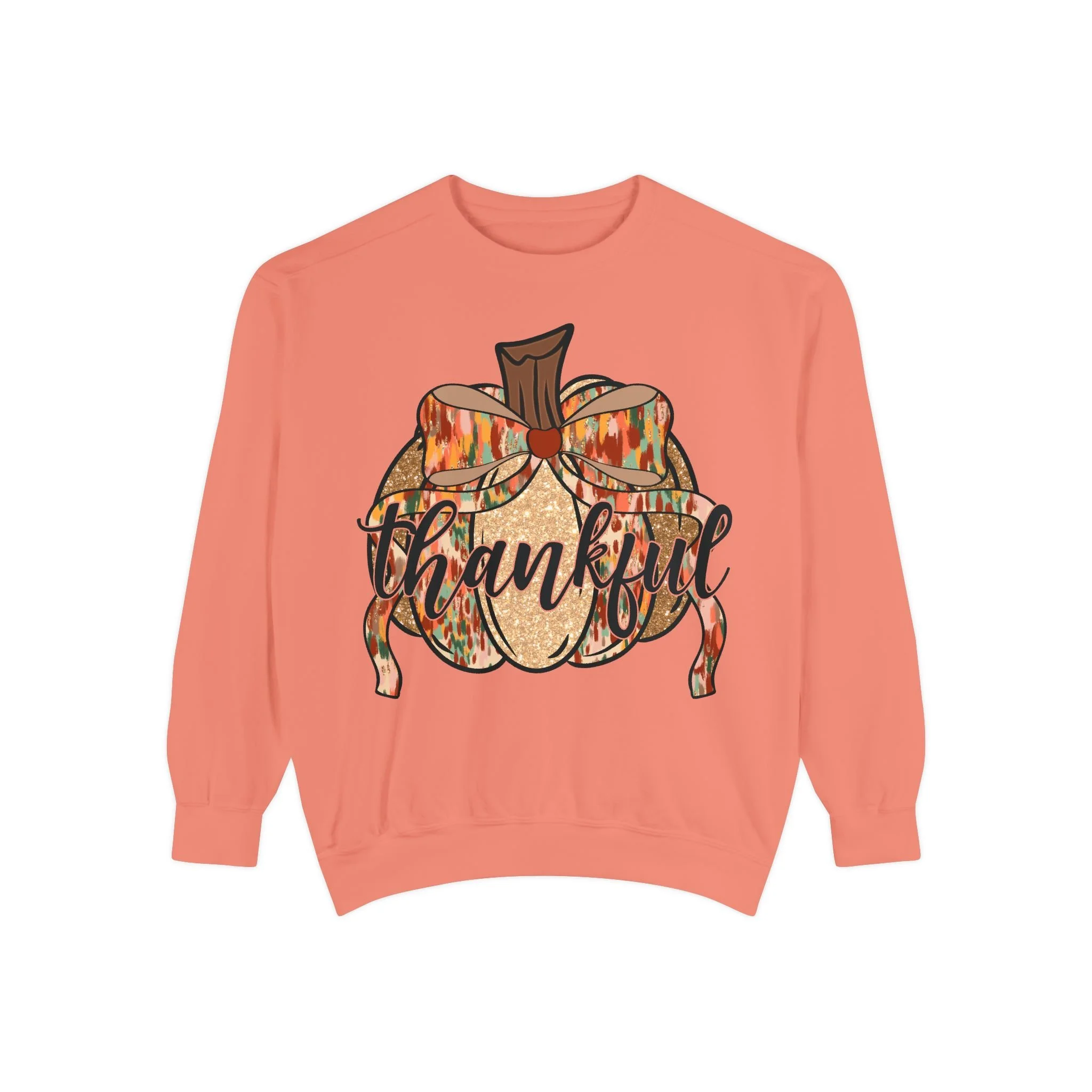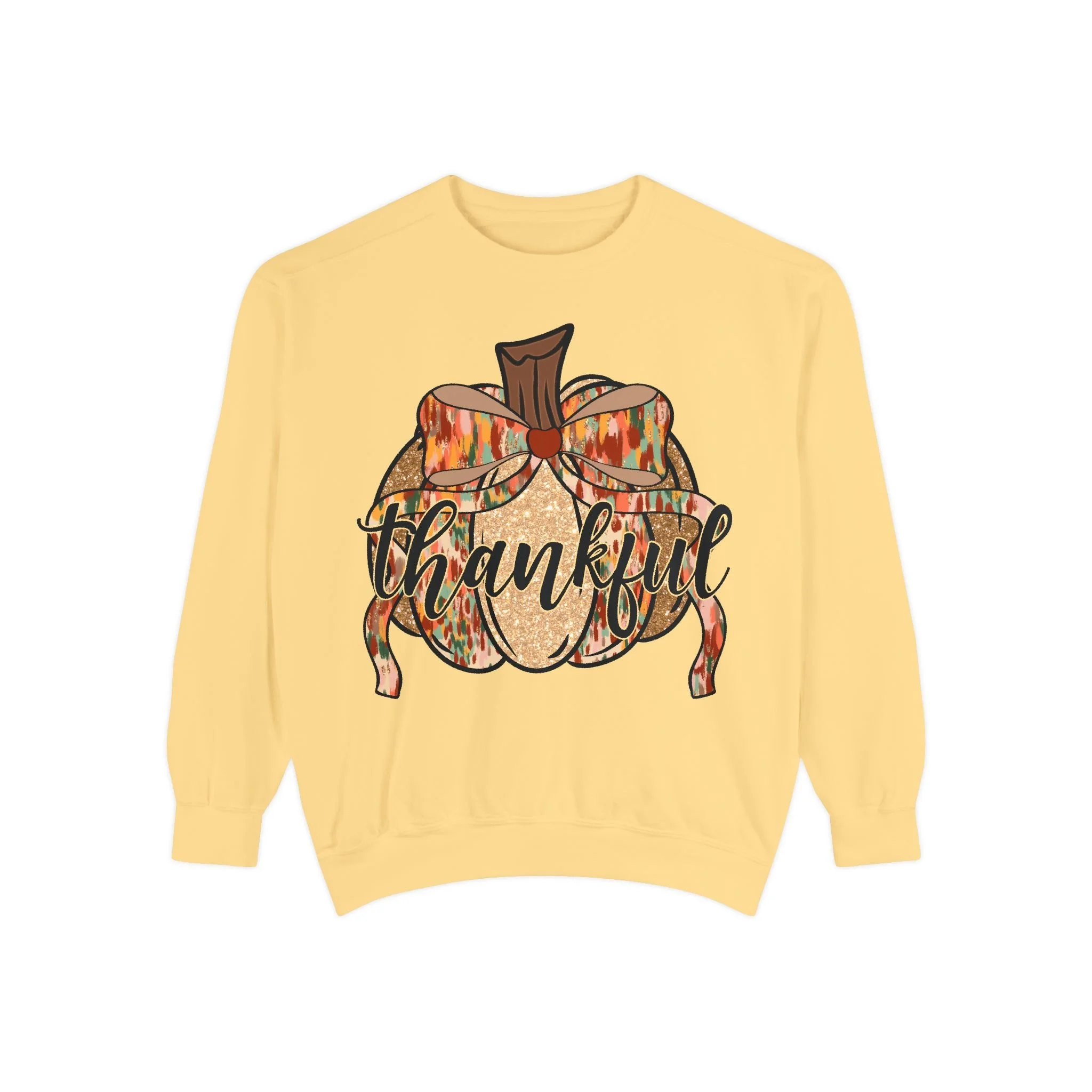 Embrace comfort and gratitude with this unisex garment-dyed sweatshirt, perfect for cozy autumn days. The soft fabric, a blend of 80% cotton and 20% polyester, feels gentle against the skin, making it your go-to choice for relaxation. Its relaxed fit provides a casual vibe, ideal for Thanksgiving gatherings, family reunions, or a casual day out. The vibrant pumpkin design adorned with the word 'thankful' captures the spirit of the season, making it a lovely gift for friends and family who cherish moments of gratitude. Whether you're hosting dinner or enjoying a cozy night in, this sweatshirt brings warmth and style to your wardrobe.