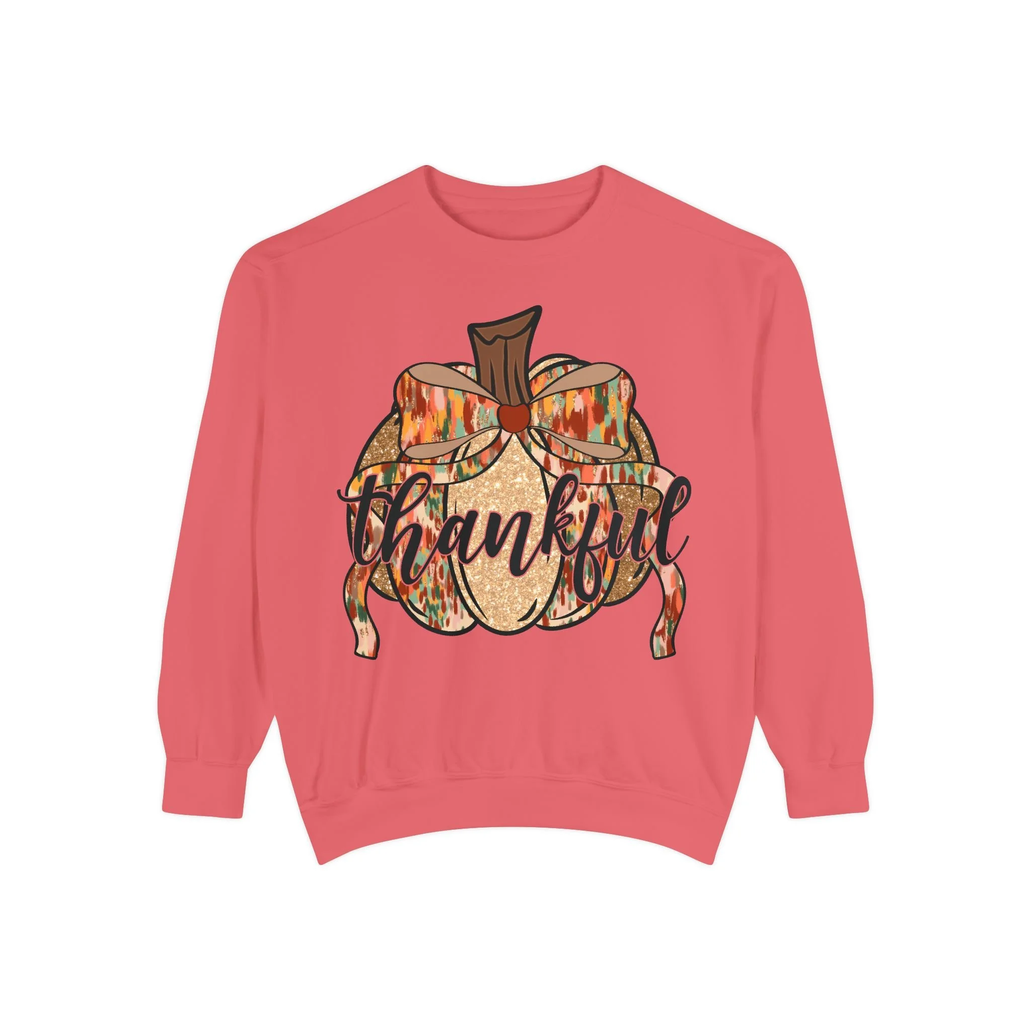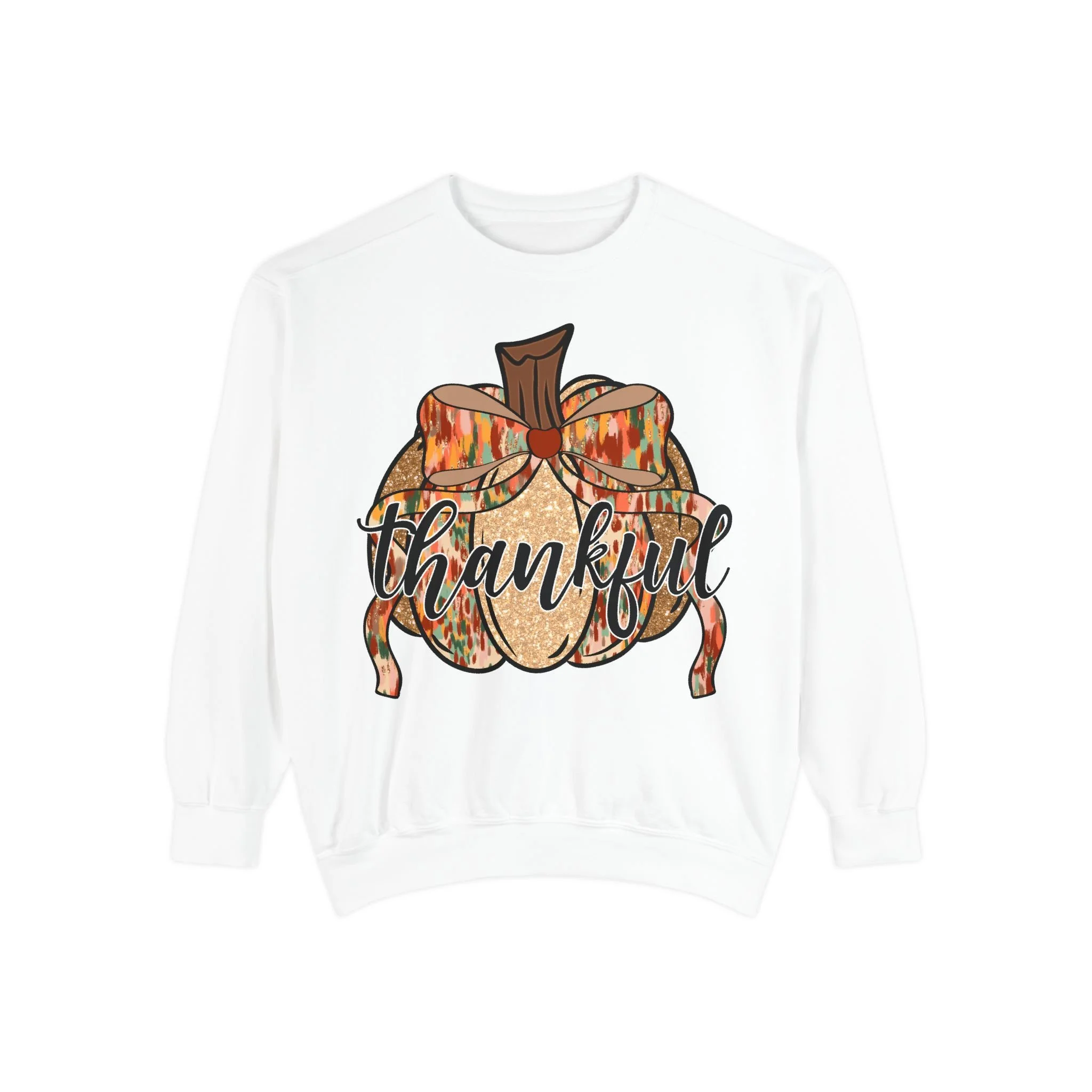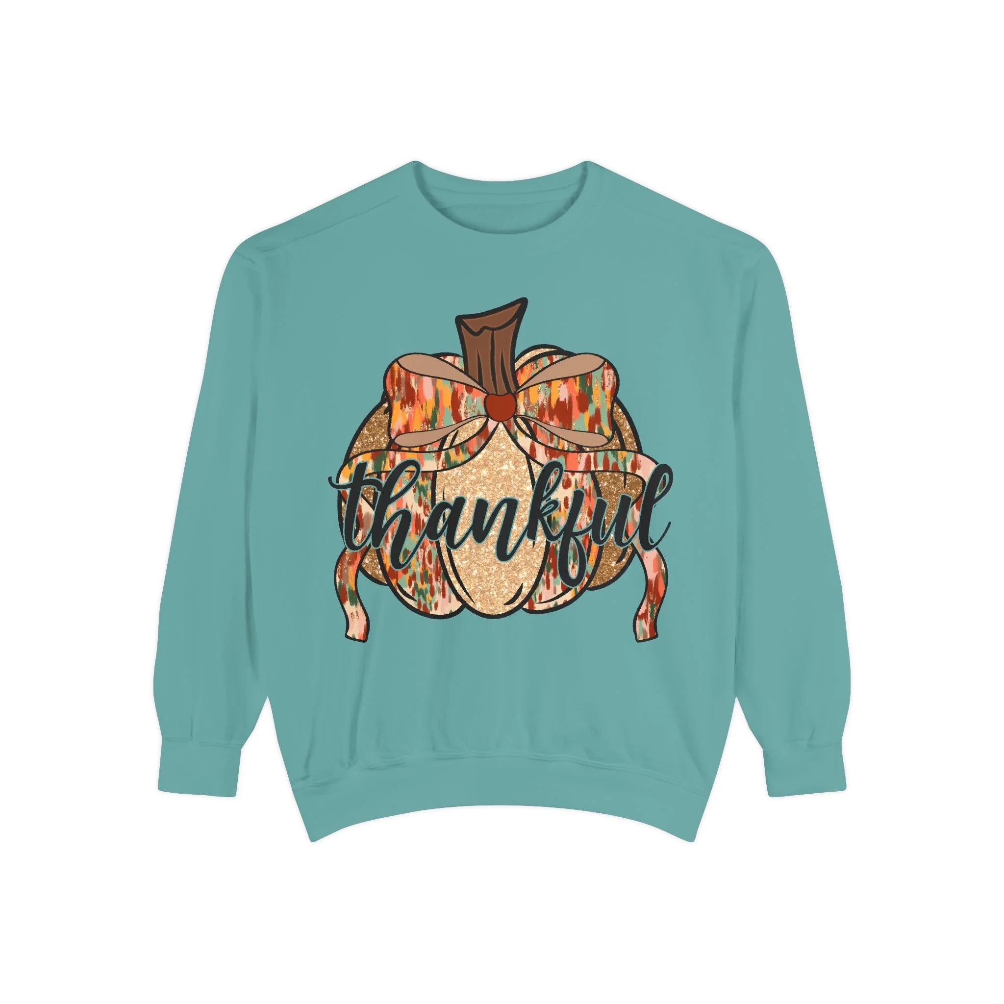 Embrace comfort and gratitude with this unisex garment-dyed sweatshirt, perfect for cozy autumn days. The soft fabric, a blend of 80% cotton and 20% polyester, feels gentle against the skin, making it your go-to choice for relaxation. Its relaxed fit provides a casual vibe, ideal for Thanksgiving gatherings, family reunions, or a casual day out. The vibrant pumpkin design adorned with the word 'thankful' captures the spirit of the season, making it a lovely gift for friends and family who cherish moments of gratitude. Whether you're hosting dinner or enjoying a cozy night in, this sweatshirt brings warmth and style to your wardrobe.