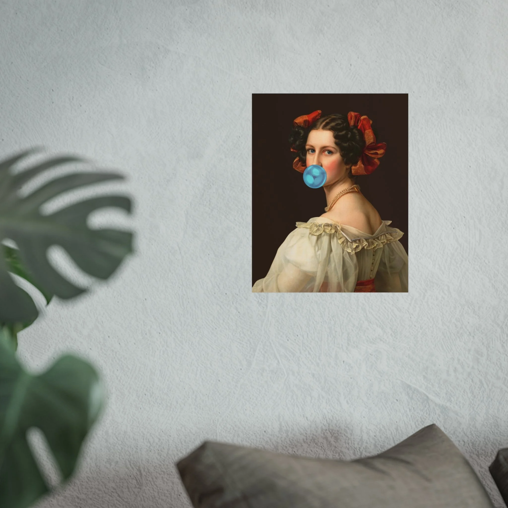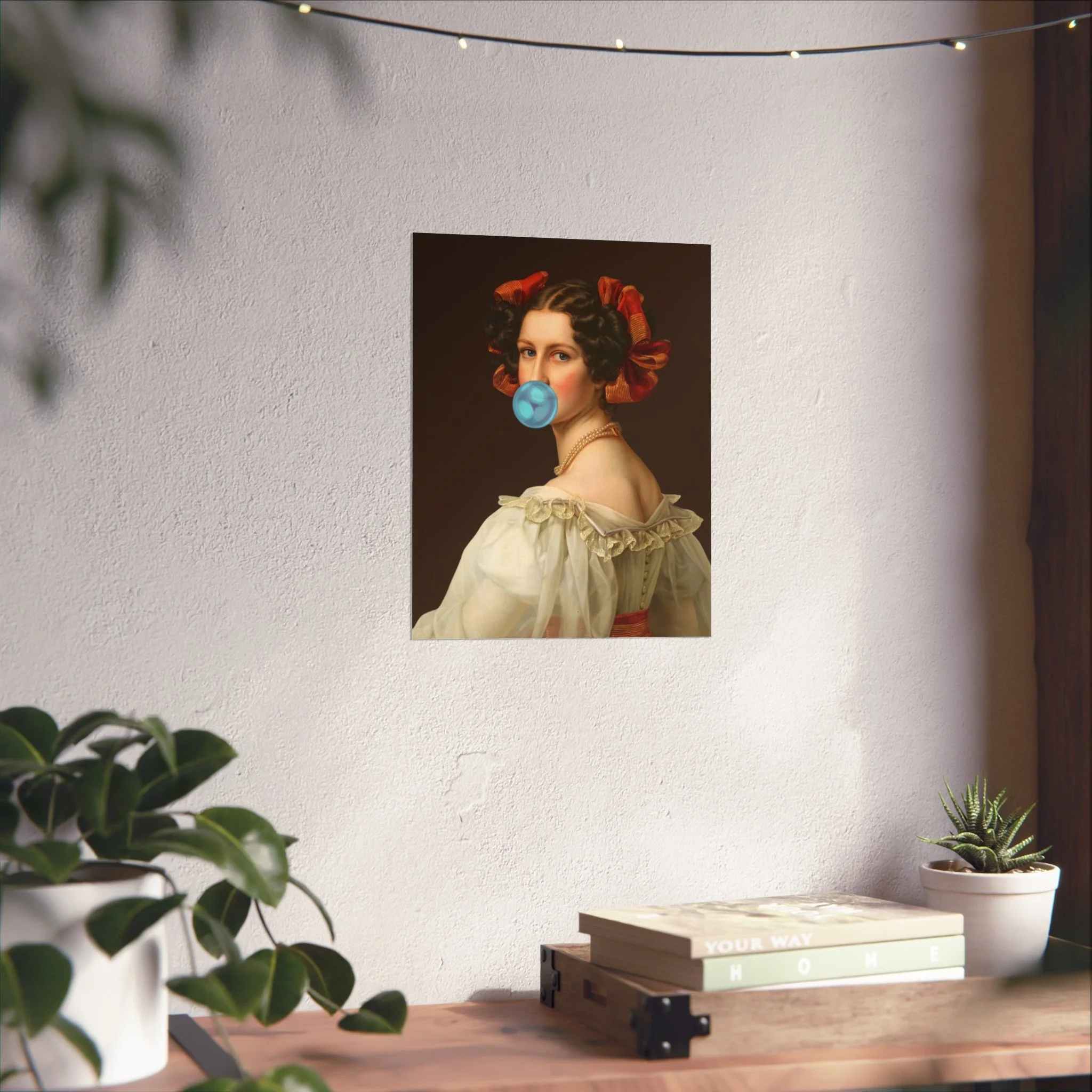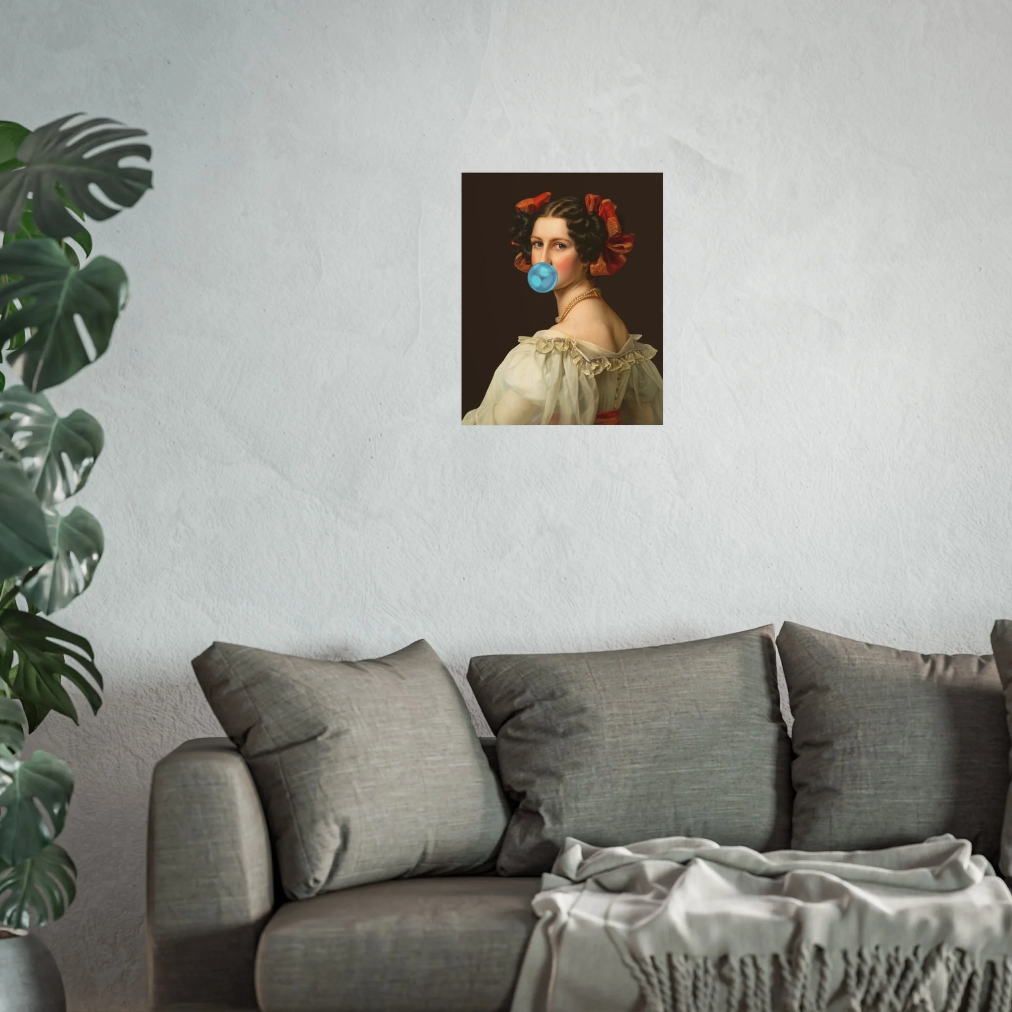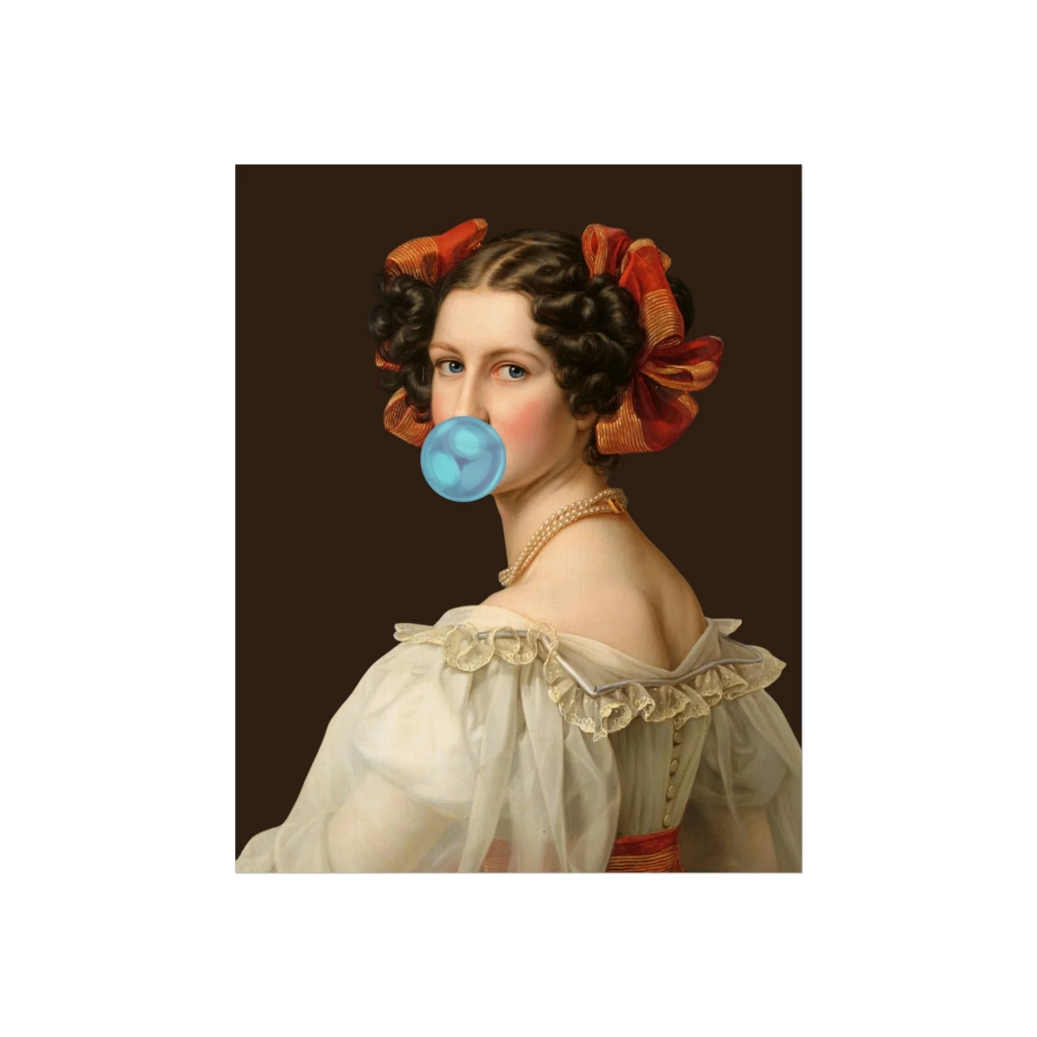 A playful fine art poster that blends old-world portraiture with a sly modern twist. The image features a romantic 19th-century sitter captured in soft, painterly tones, punctuated by an unexpected pop of color—a bright bubble of chewing gum—bringing wit and contemporary attitude to classic elegance. Printed with giclée precision on gallery-grade, 220 gsm matte paper, the piece reads as both conversation starter and refined wall art. It settles beautifully above a sofa or within a curated gallery wall, adding a dash of humor without losing sophistication.