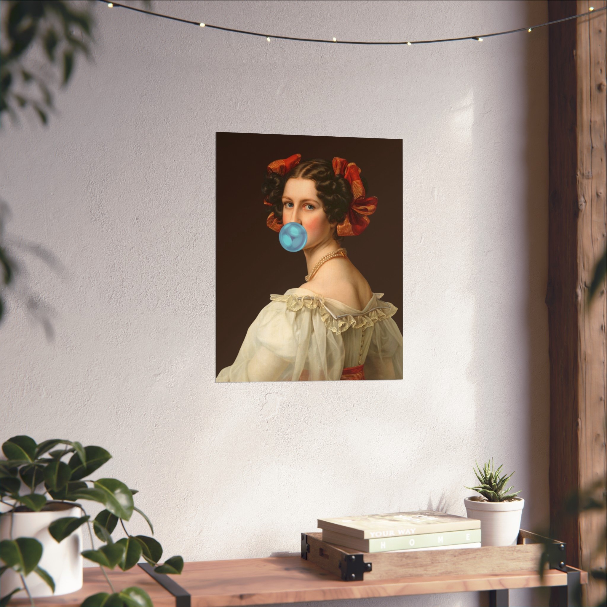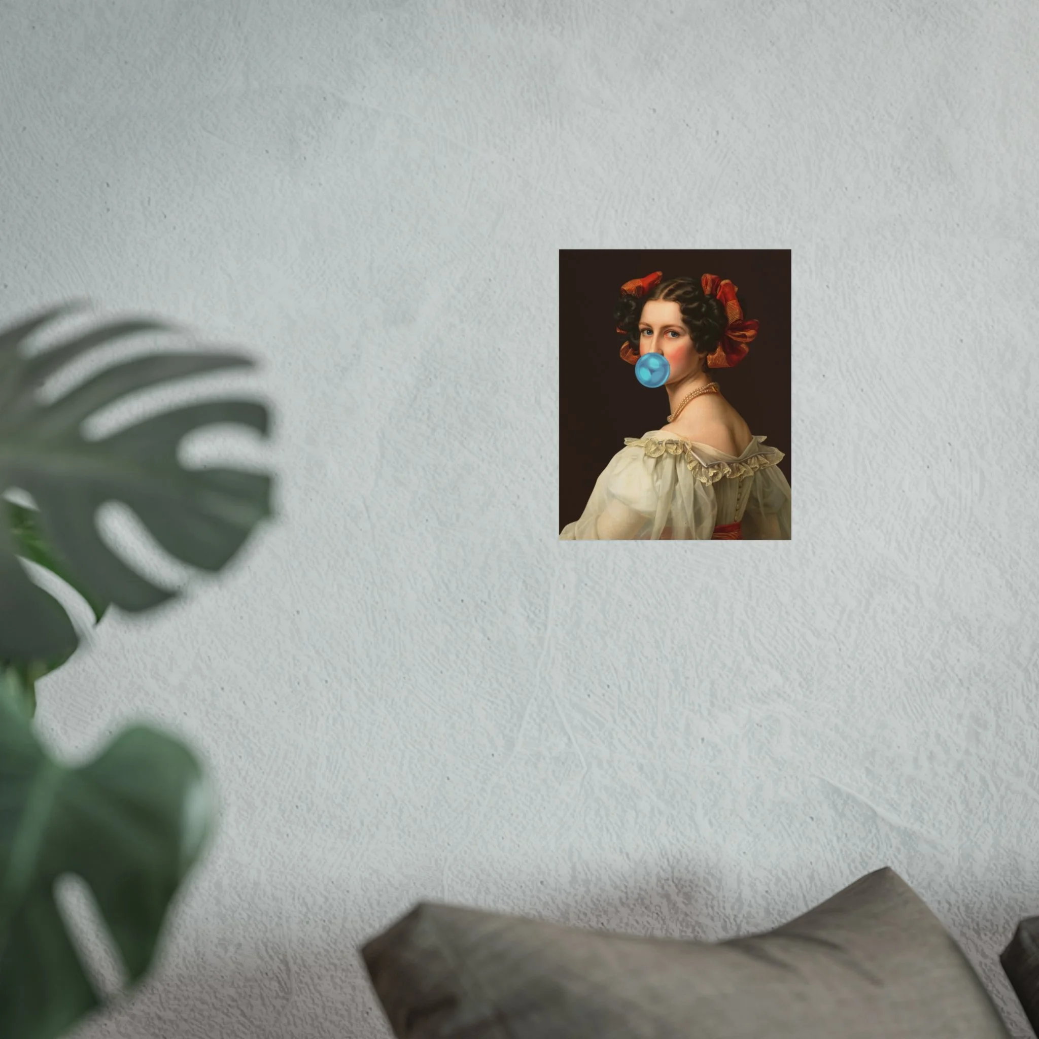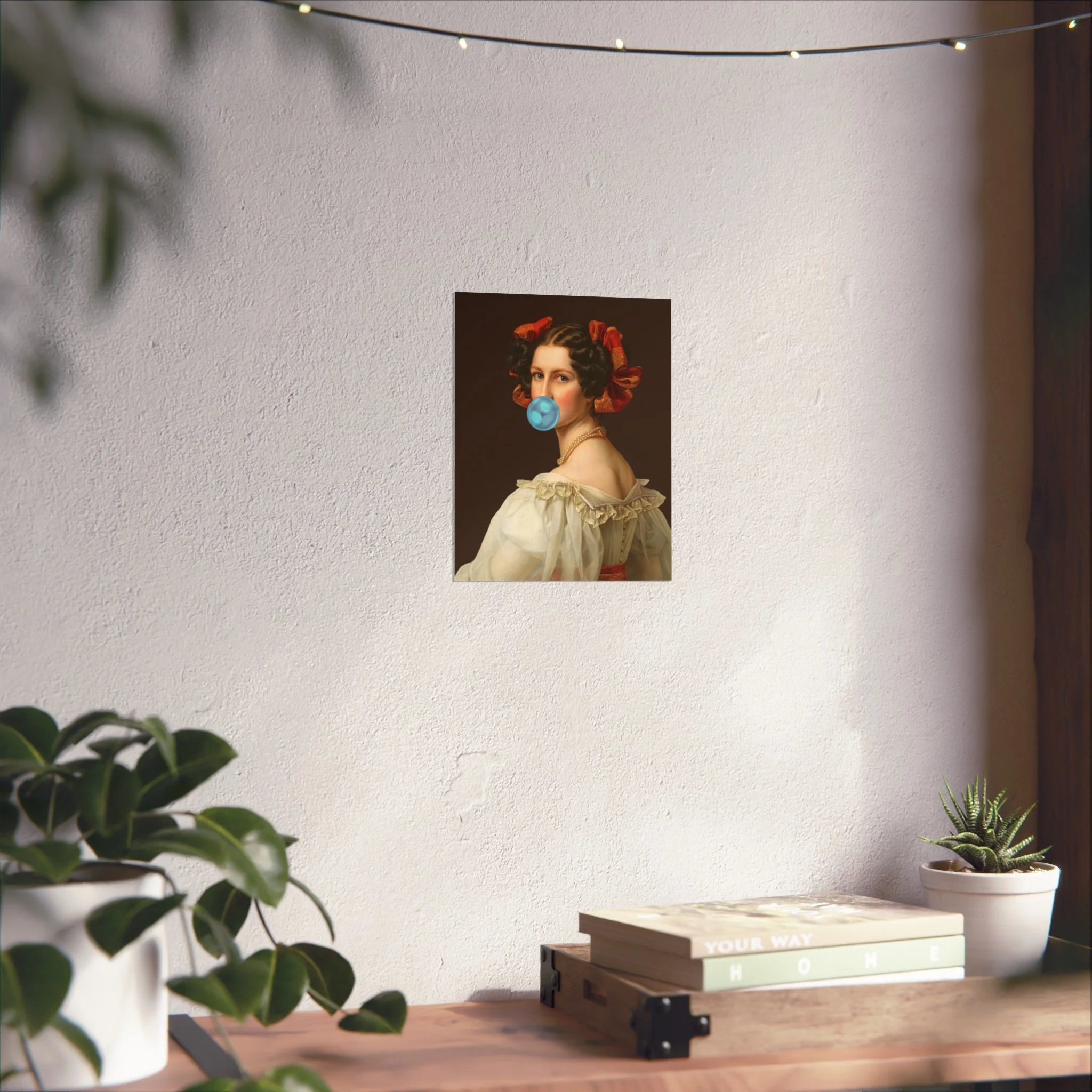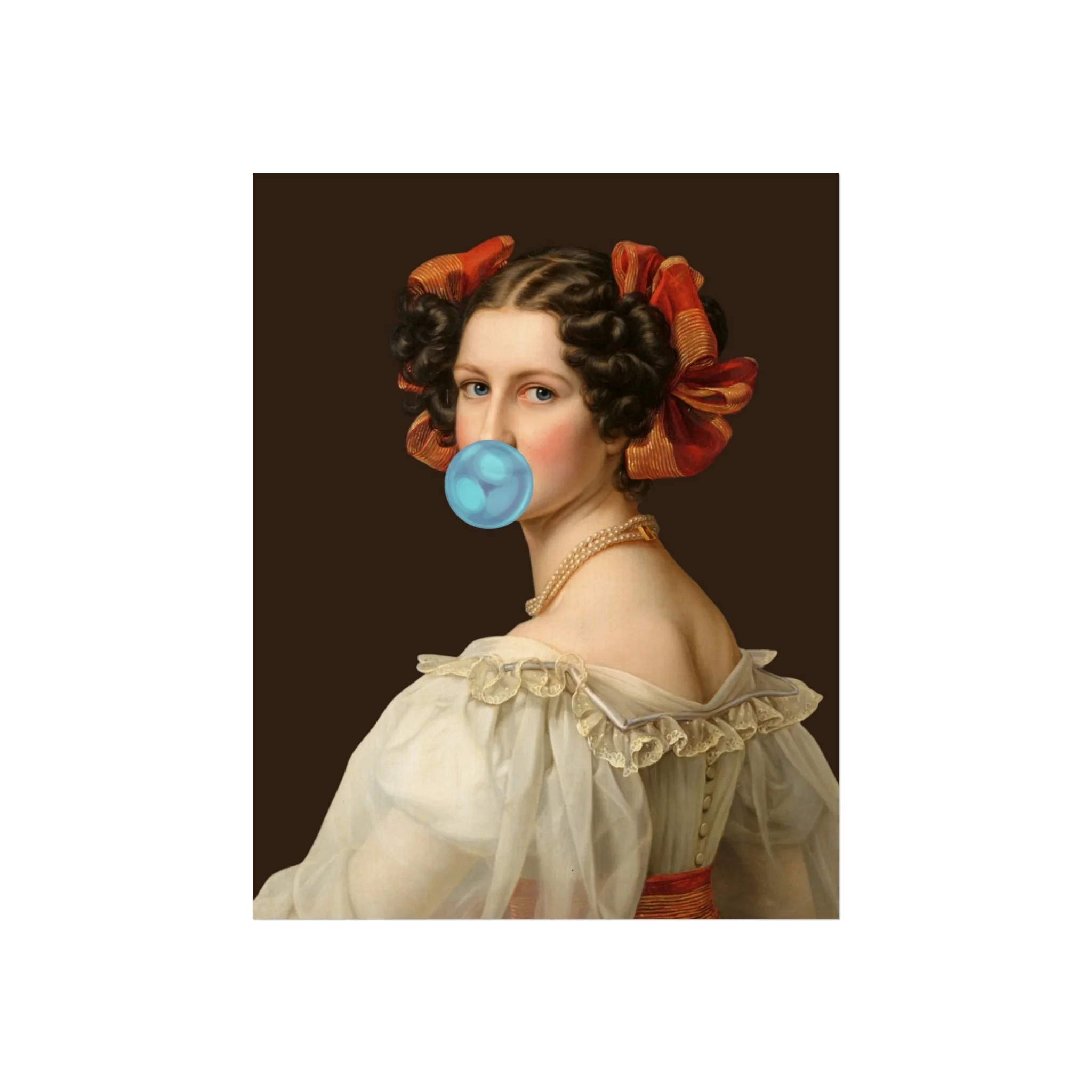 A playful fine art poster that blends old-world portraiture with a sly modern twist. The image features a romantic 19th-century sitter captured in soft, painterly tones, punctuated by an unexpected pop of color—a bright bubble of chewing gum—bringing wit and contemporary attitude to classic elegance. Printed with giclée precision on gallery-grade, 220 gsm matte paper, the piece reads as both conversation starter and refined wall art. It settles beautifully above a sofa or within a curated gallery wall, adding a dash of humor without losing sophistication.